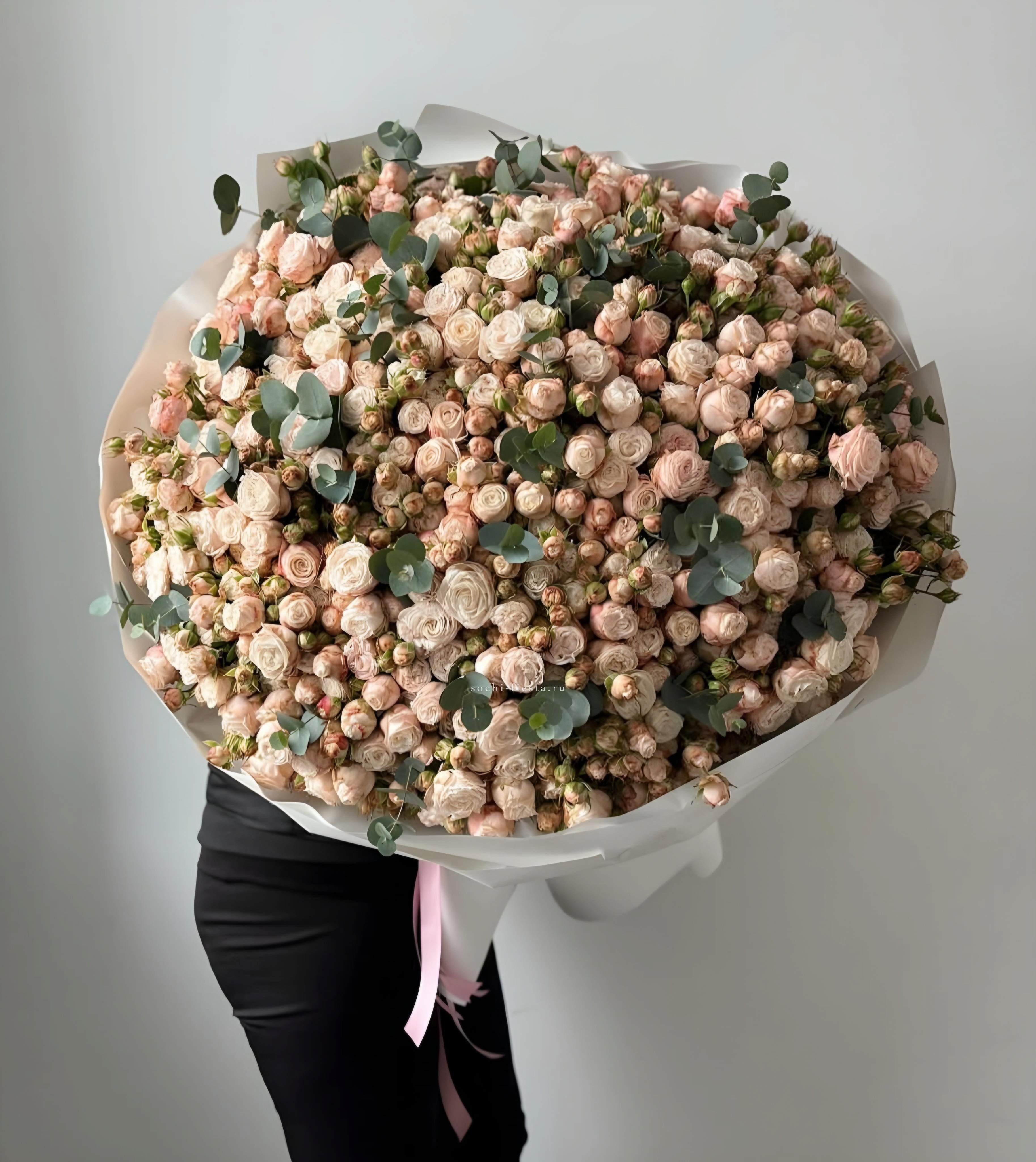 Одиннадцать кустовых роз с густыми многолепестковыми бутонами в нежно-розовой гамме. Каждая ветка раскрывается несколькими головками, создавая пышную объемную форму. Для тех, кто любит выразительные букеты с характером.
