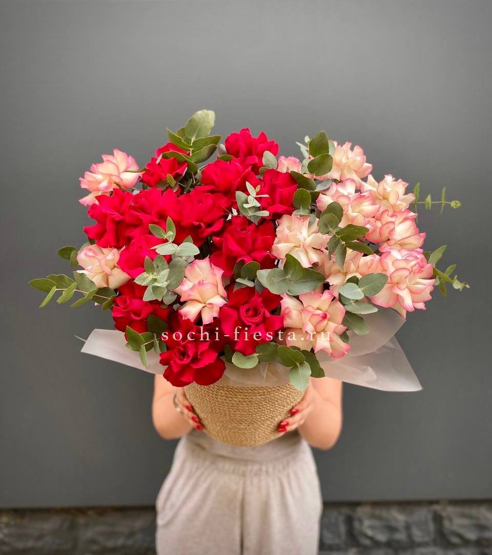 вывернутые французские розы, джутовое кашпо.