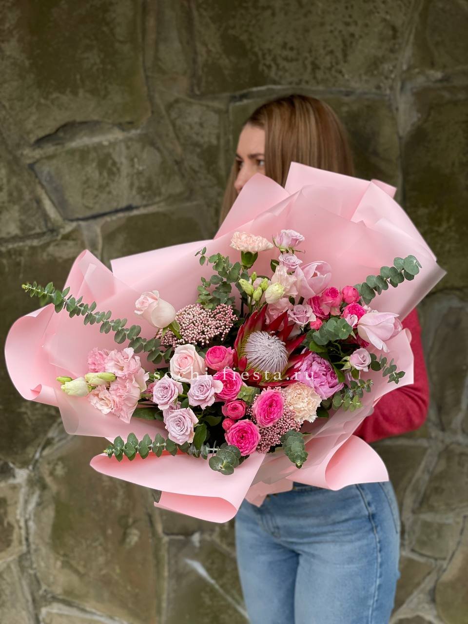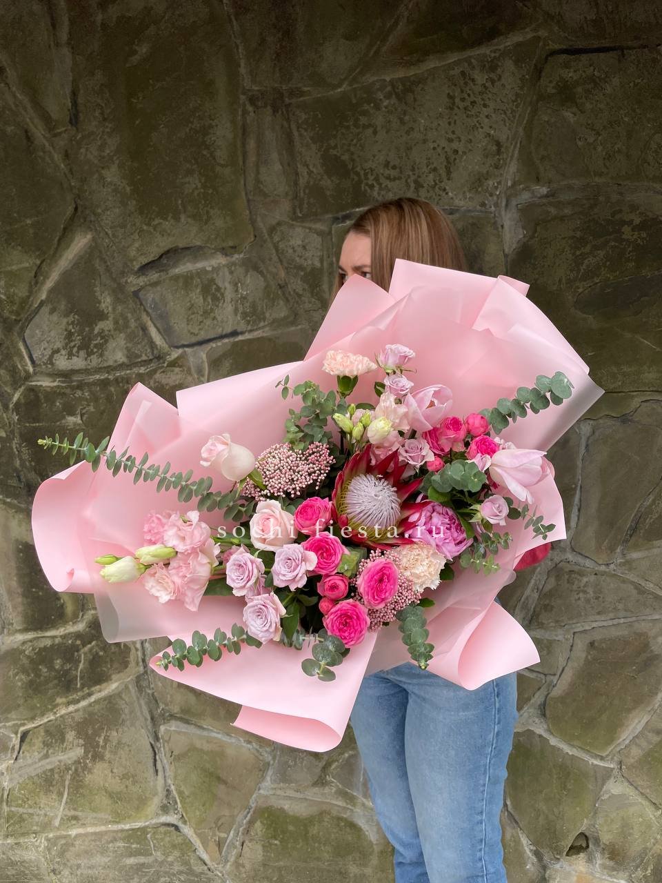 розовые гортензии, эвкалипт, пленка.