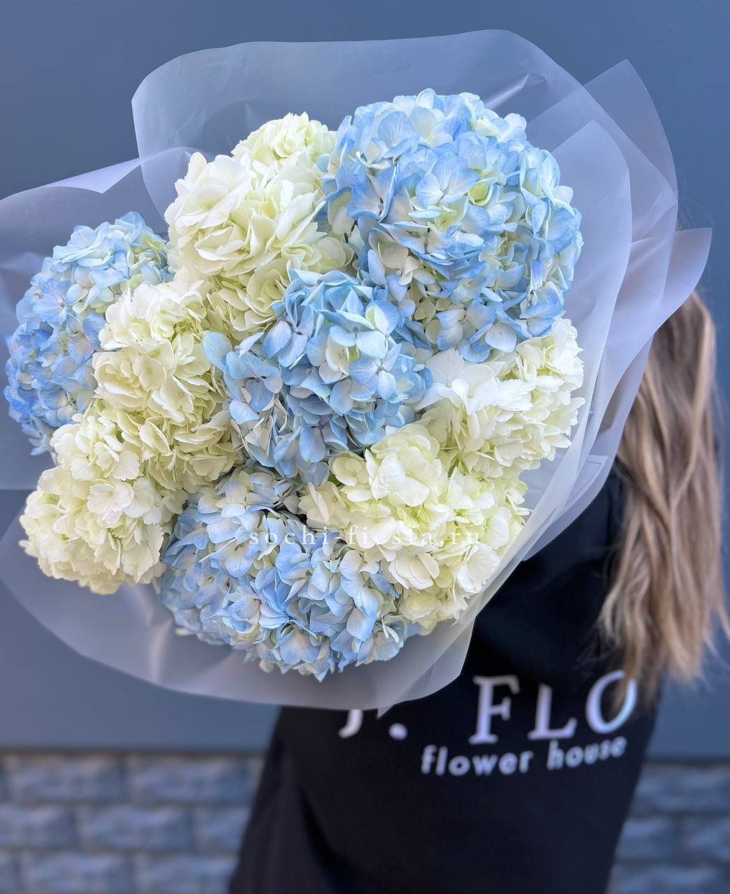 Девять пышных соцветий собраны в композицию с насыщенным объемом. Переход от белого к голубому создает глубину и движение внутри букета.