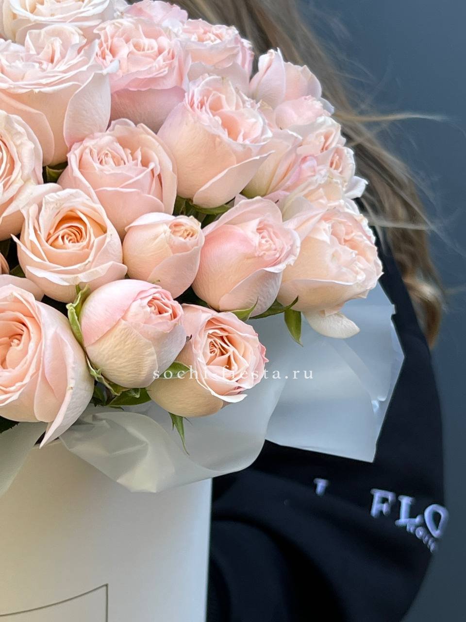 гортензия, вывернутые розы, диантус, кустовая роза, диантусы, оформление в боксе.