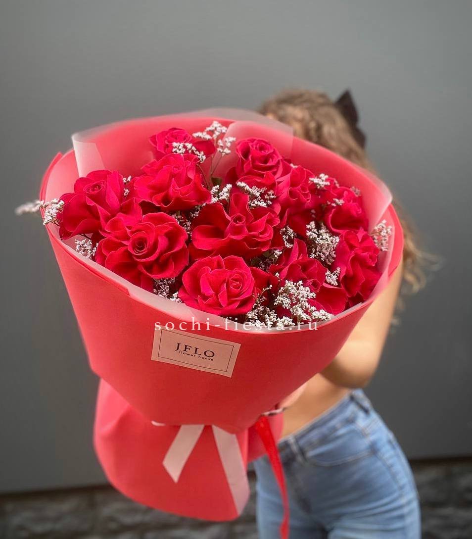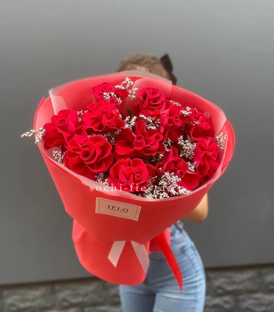 букет из 11 алых роз с добавлением лимониума.