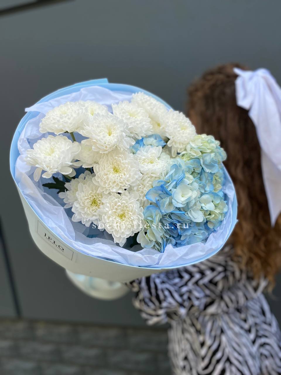Мисти Баблс и гортензии в воздушной упаковке дарят ощущение свежести раннего утра. Лёгкая структура букета сохраняет форму и долго радует глаз.