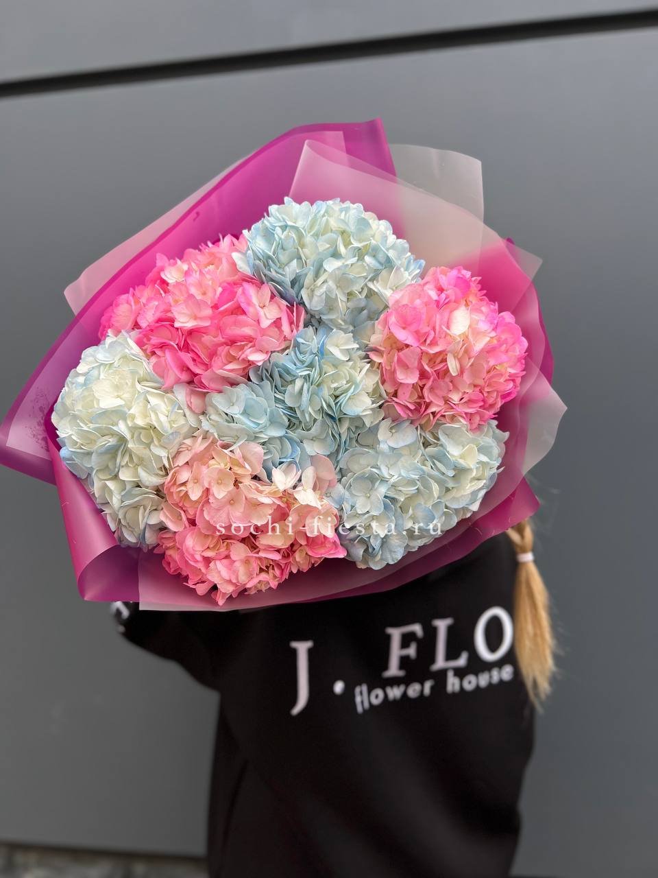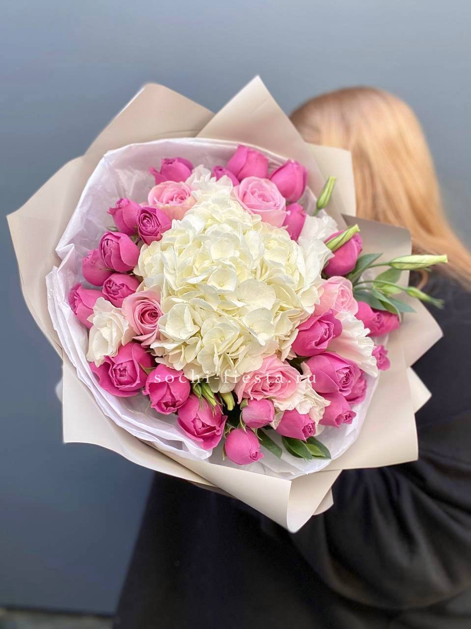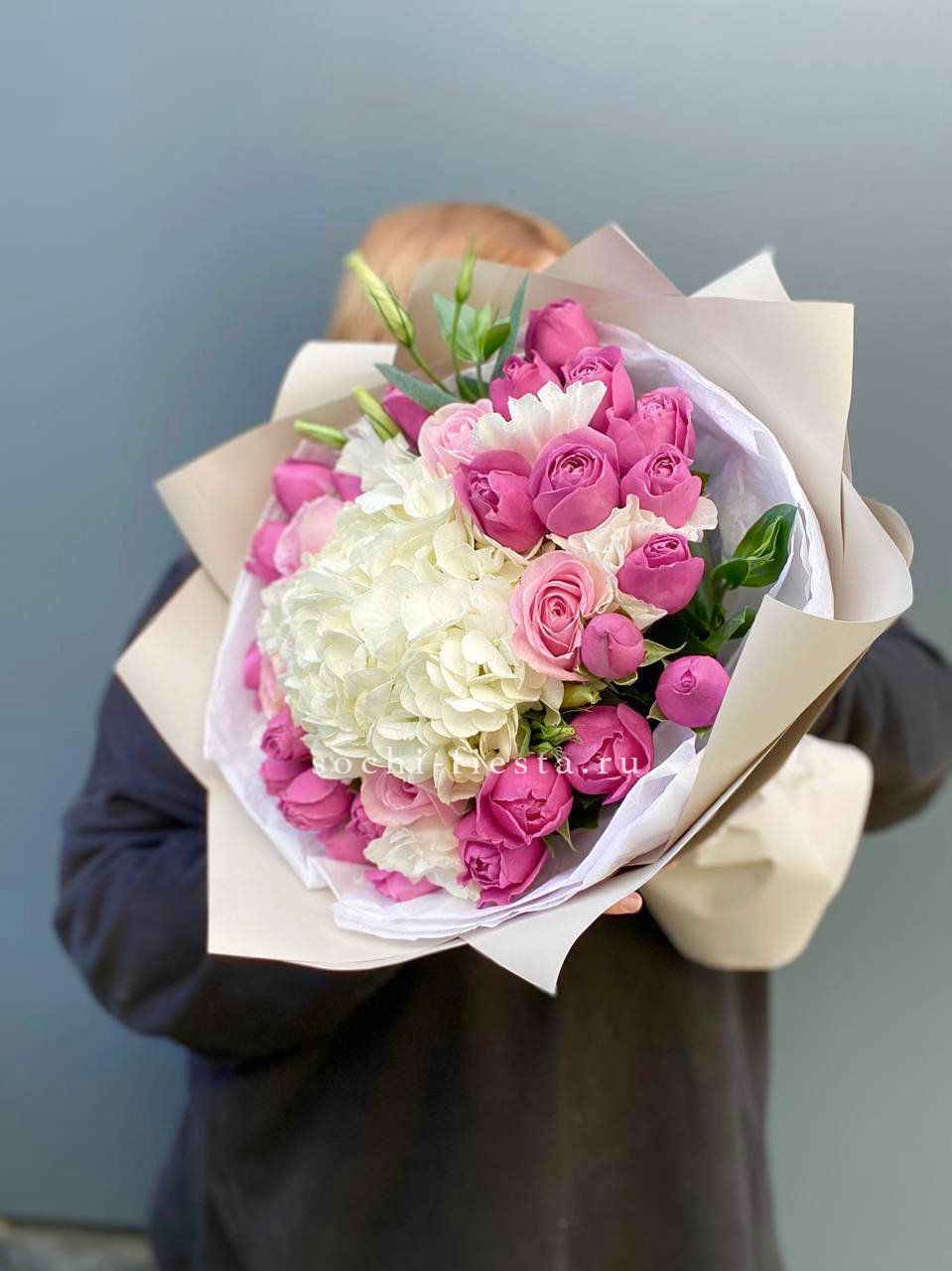 Семь соцветий гортензии раскрываются воздушным облаком с мягкими переходами оттенков. Букет дарит ощущение лёгкости и свежести летнего сада в любое время года.