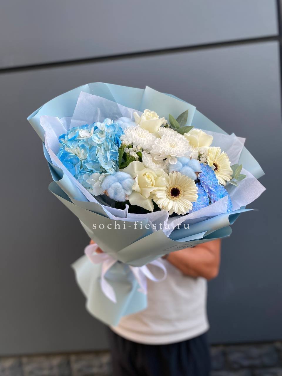 гортензия, хризантема, белая роза, гербера, статица, хлопок, упаковка.