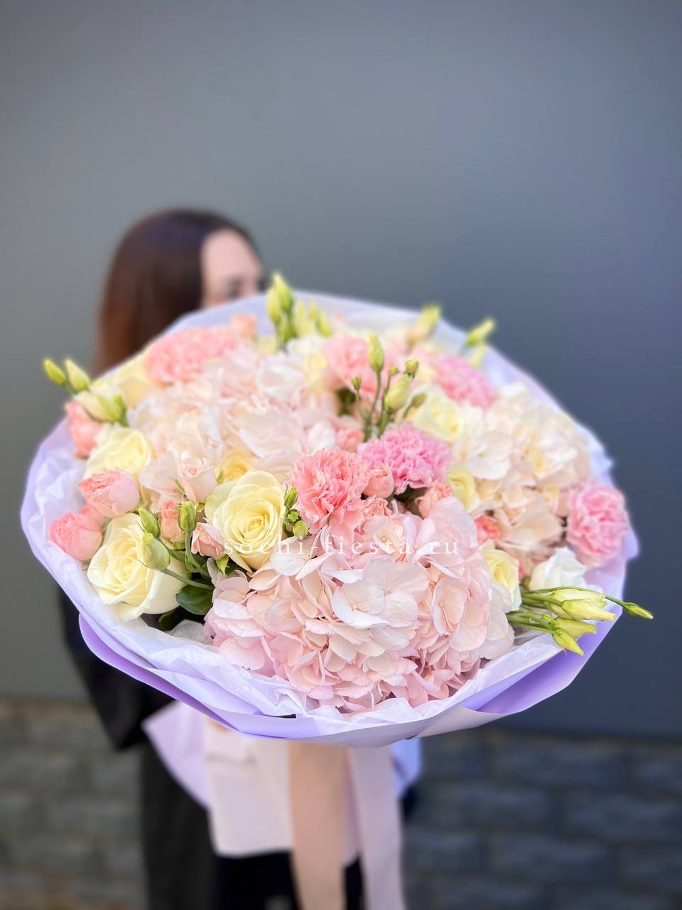 Крупные шапки гортензий формируют основу композиции, розы и эустомы заполняют пространство между ними. Диантусы добавляют графичности. Букет с впечатляющим присутствием и богатой палитрой.