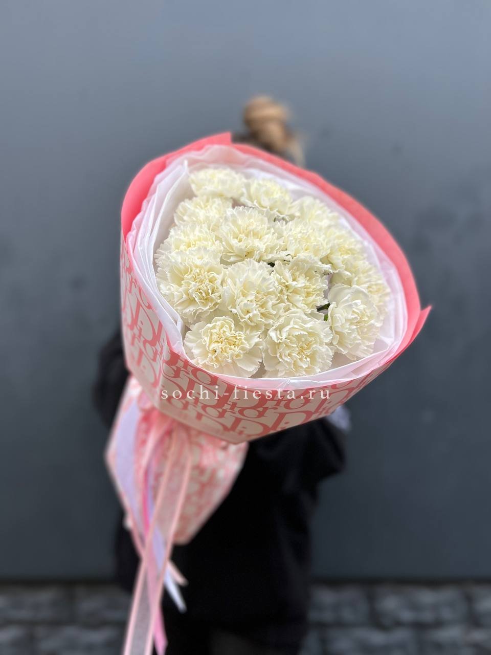 15 белых диантусов,ковыль,лагурус, эвкалипт, лента, дизайнерская пленка.