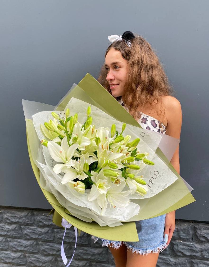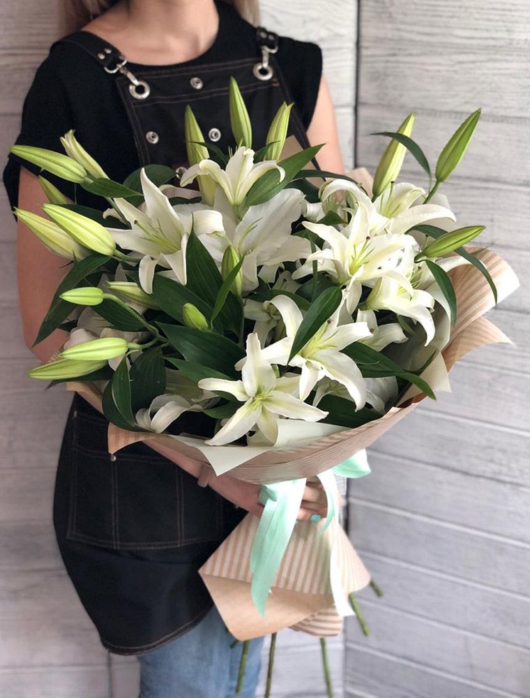Семь белых лилий собраны в классический букет с лаконичной упаковкой. Крупные бутоны раскрываются постепенно, наполняя пространство своим присутствием.