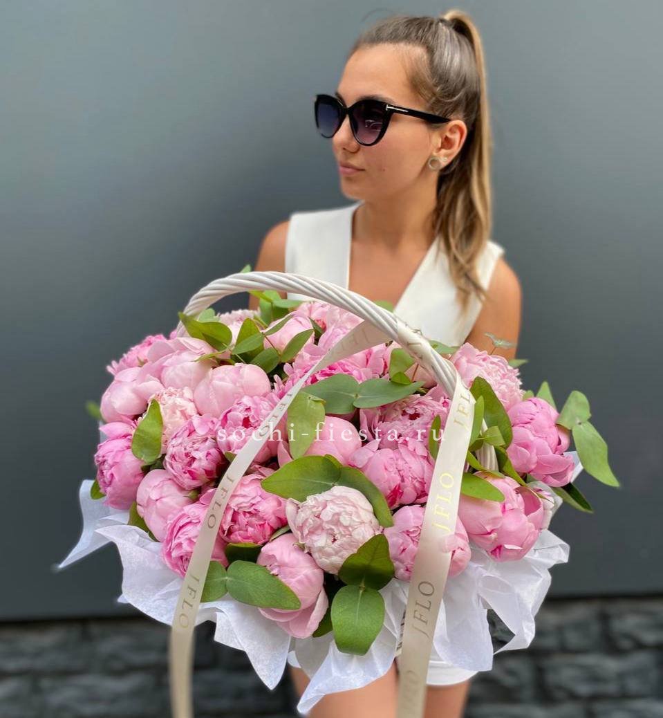 Двадцать девять пионов с ветками эвкалипта собраны в классическую корзину. Бутоны разной степени раскрытия формируют воздушный купол, который сохраняет свежесть и аккуратный силуэт несколько дней.