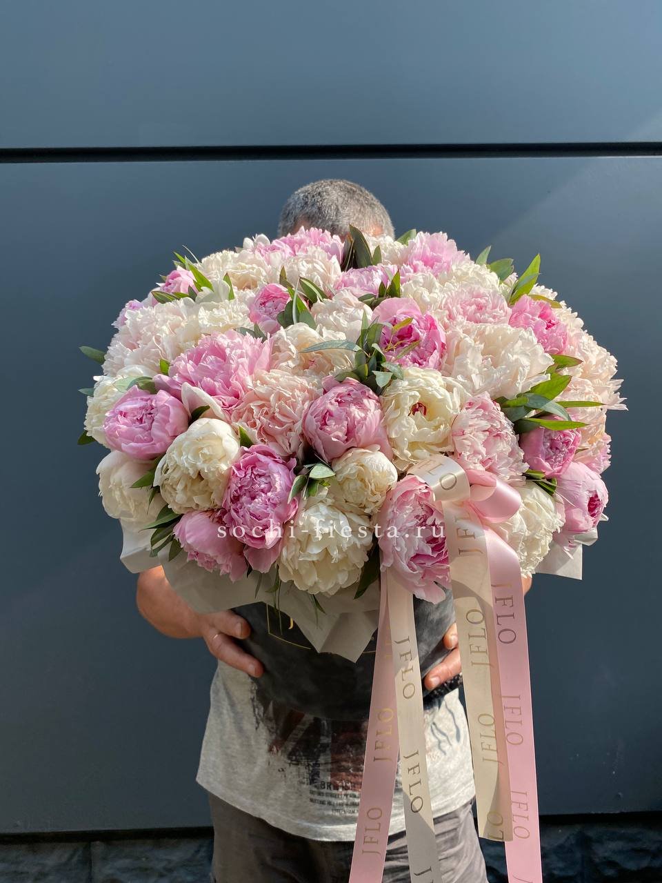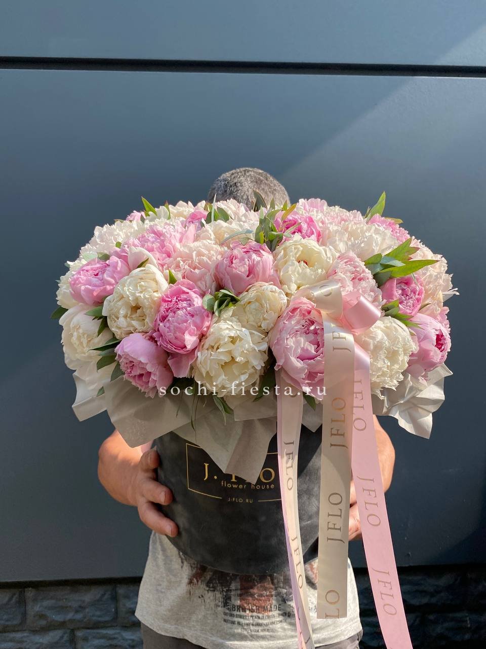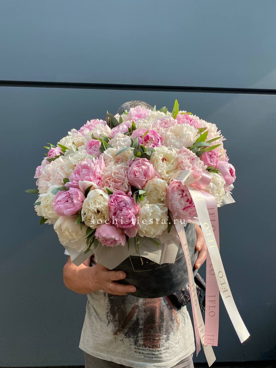 Пятьдесят один пион в бархатном боксе создаёт впечатляющий объём и наполняет пространство. Плотная укладка бутонов формирует цветочное полотно с глубиной и текстурой.