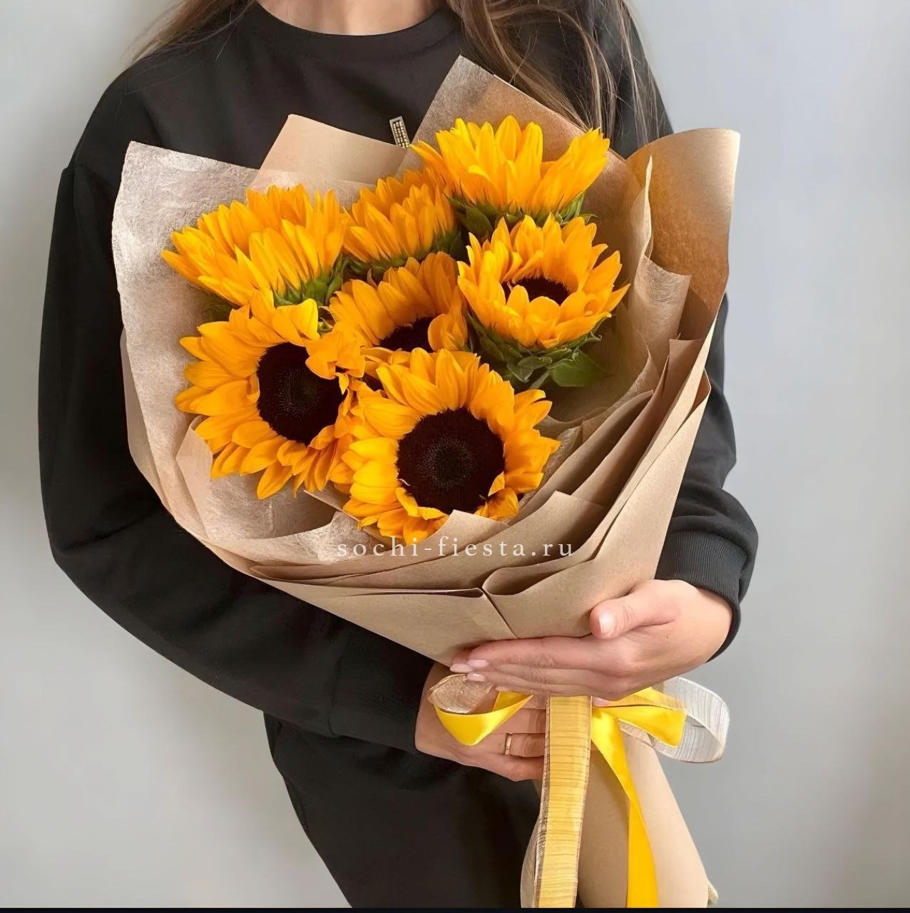 7 подсолнухов, лента, авторское оформление.