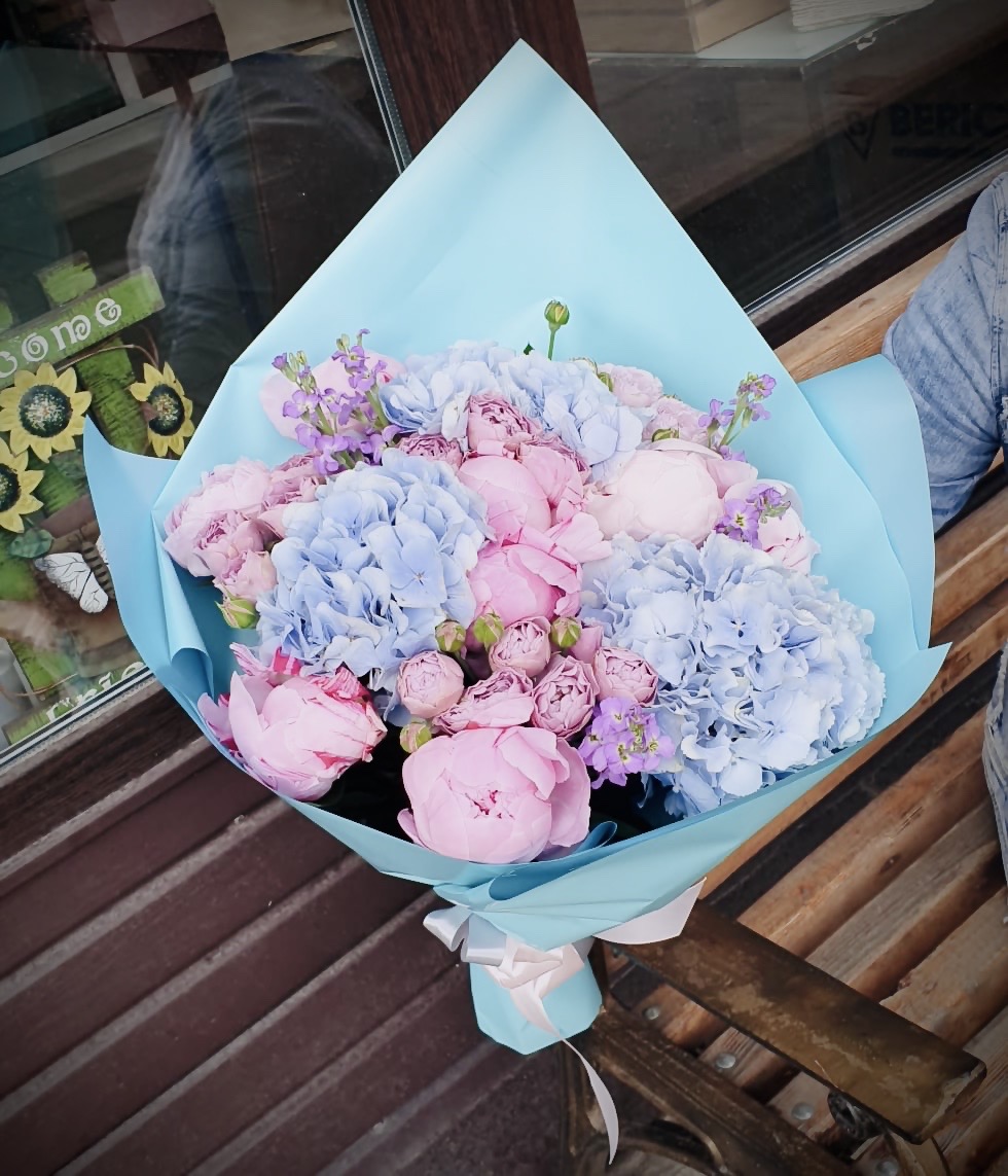 гортензии, пионы, пионовидная кустовая роза, маттиола, лента, дизайнерская упаковка.
