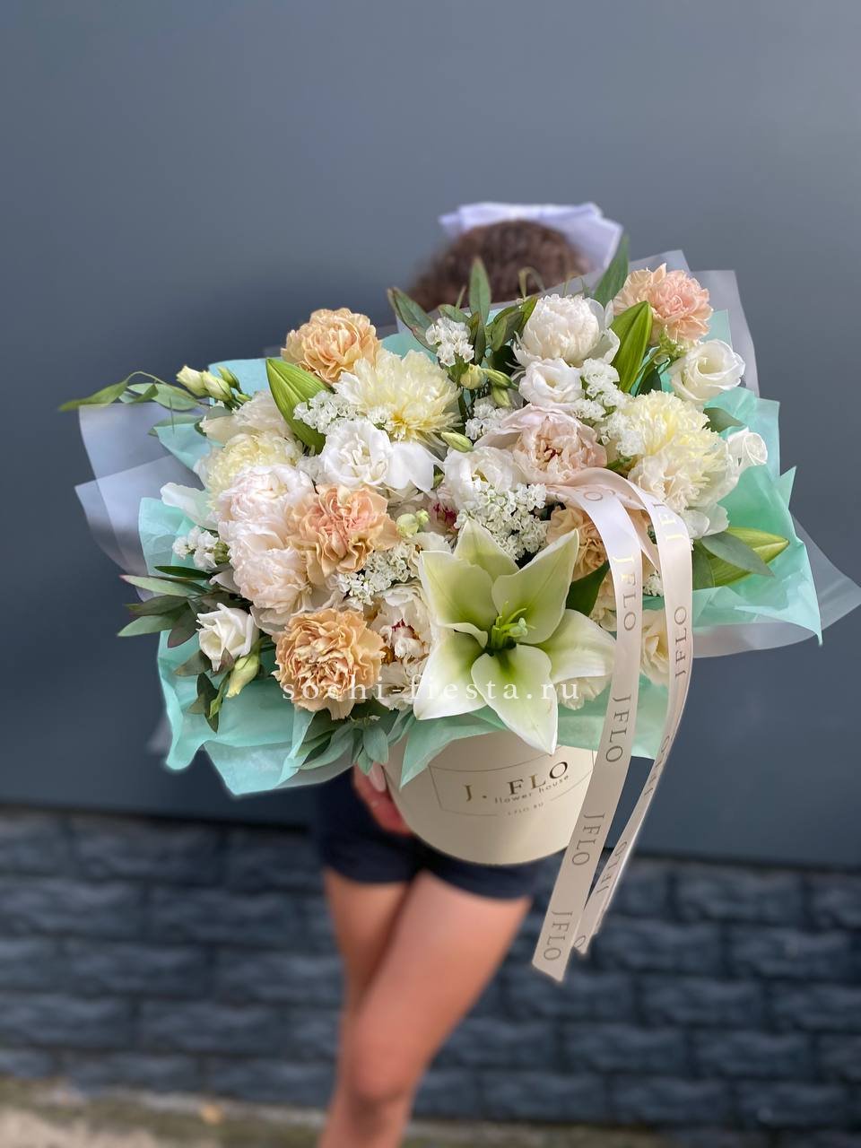 лилии, диантусы, статица, пионы или замена в не сезон эвкалипт, цилиндр.Состав может меняться в зависимости от сезона.