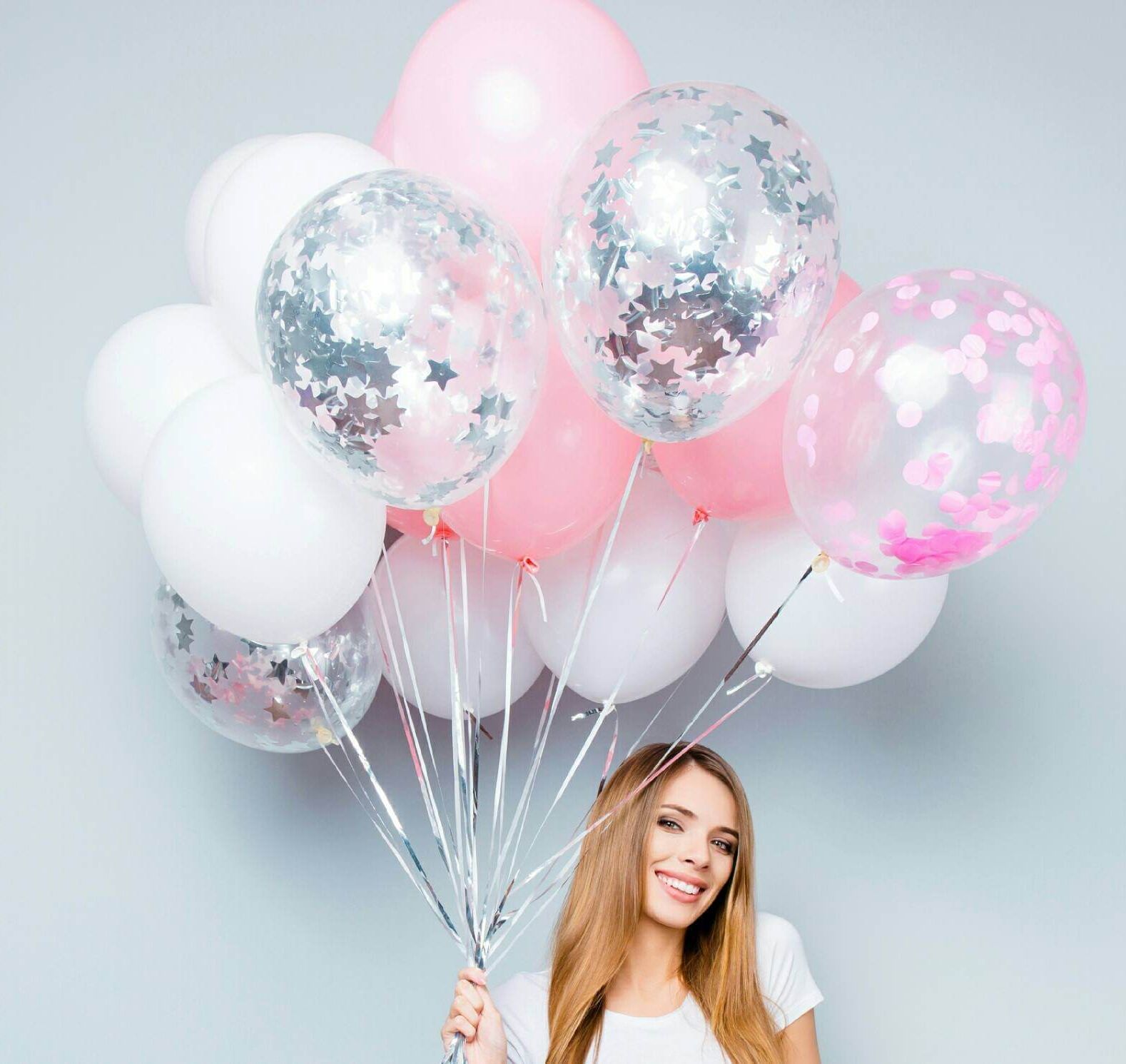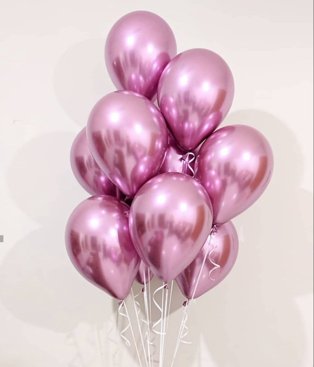 3 шт. фольгированных шара сердце розовое золото (без надписи), 3 шт. латексных нежно-розовых шара, 3 шт. хромированных золотых шаров, 2 шт. хромированных розовых шаров, грузик. Все шары мы предварительно обрабатываем специальным составом Highfloat, обеспечивая им длительный срок полета.