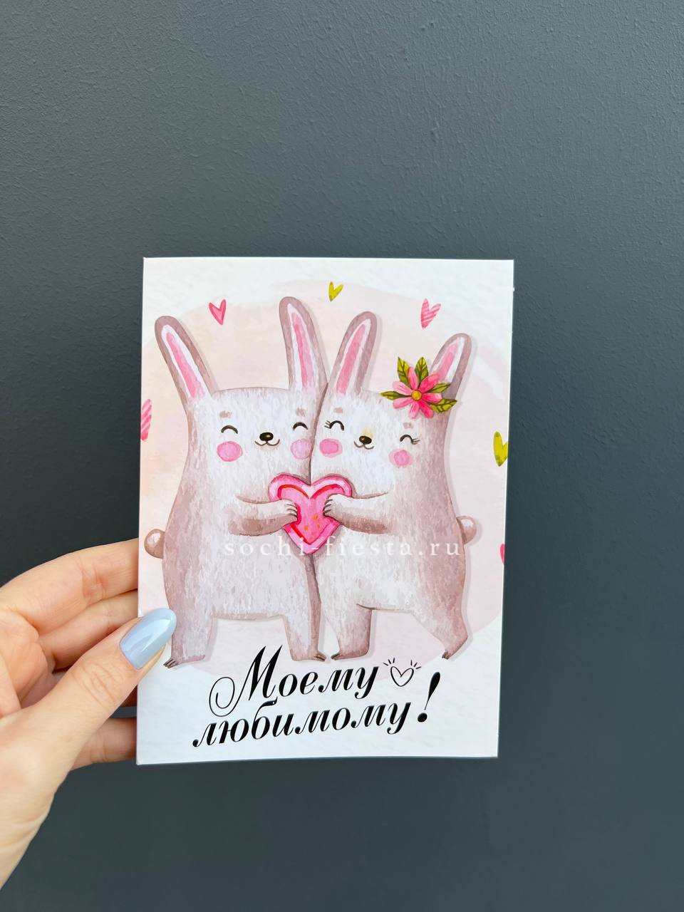 открытка с любовными посланиями на шоколаде. Внутри надпись: Люблю тебя очень сильно!!! Также 4 молочных шоколадки. Размер открытки: 10х15см