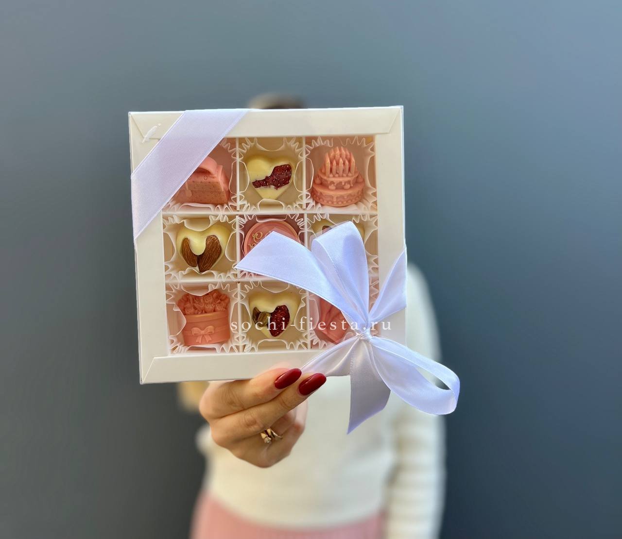 Хрустящий миндаль и фисташки встречаются с нежной клубникой под слоем белого бельгийского шоколада. Каждая конфета создана вручную и собрана в коробку диаметром 15 см. Яркий акцент для праздничного стола.