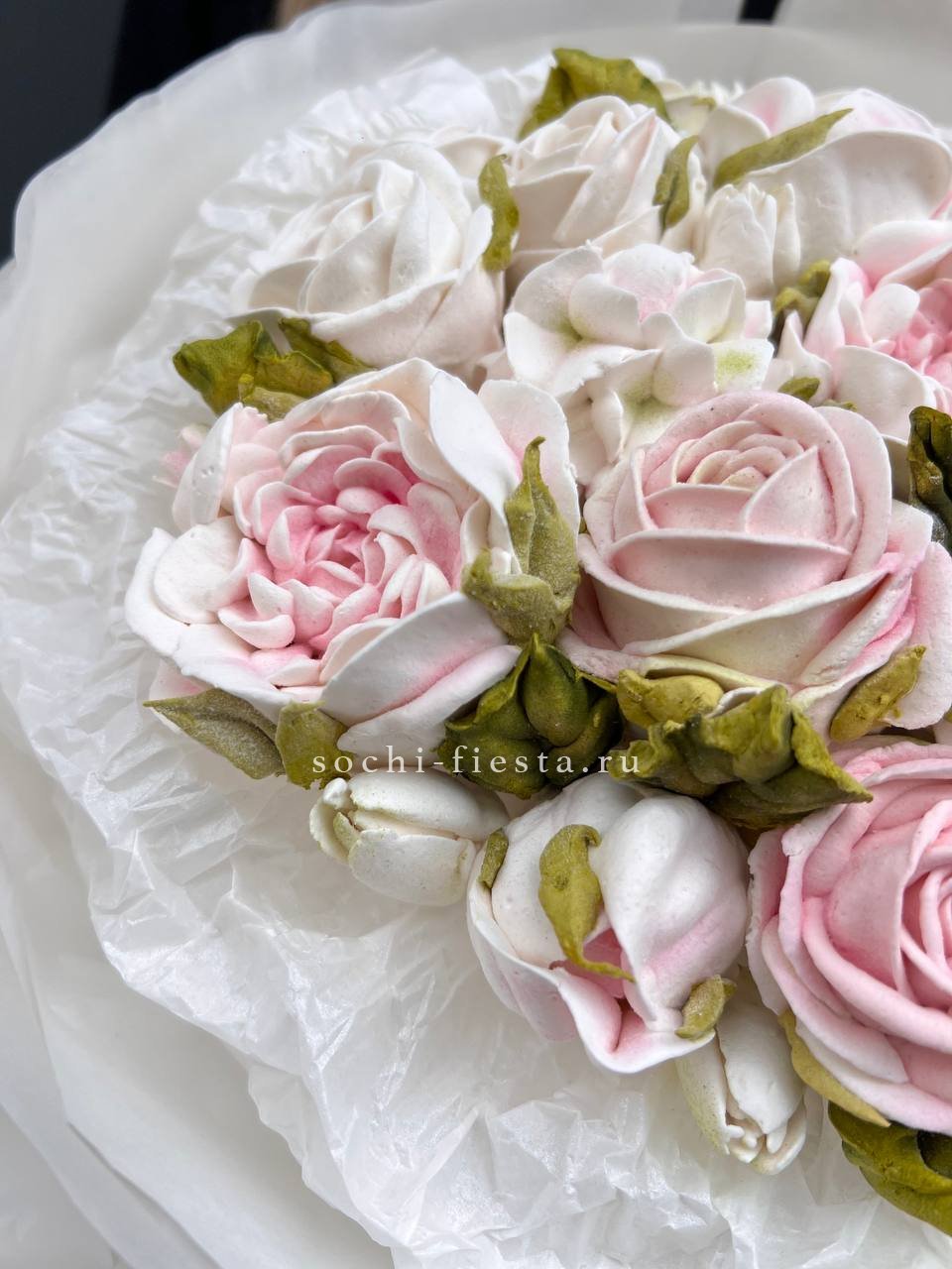Воздушные лепестки из зефира собраны в объемную композицию. Натуральные оттенки и мягкая текстура делают этот букет необычным дополнением к celebration.