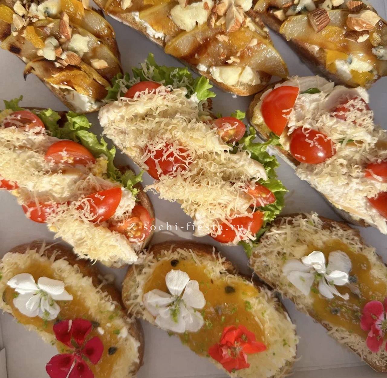 Шестнадцать брускетт с мясными и рыбными начинками. Говядина с вялеными томатами, паштет из печени, семга с огурцом и карбонад с черри раскрывают богатство вкусов в одной подаче.
