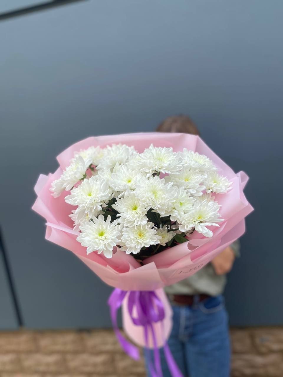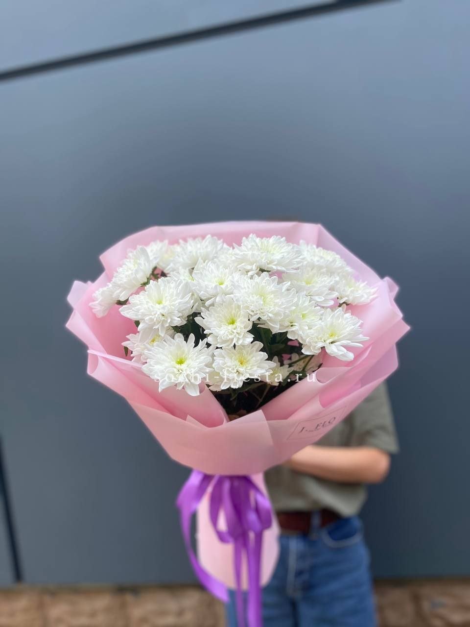 Яркие шапки хризантем собраны в компактной коробке с атласными лентами. Цветы держат форму и радуют свежестью несколько дней подряд. Удобный формат для размещения на столе или комоде.