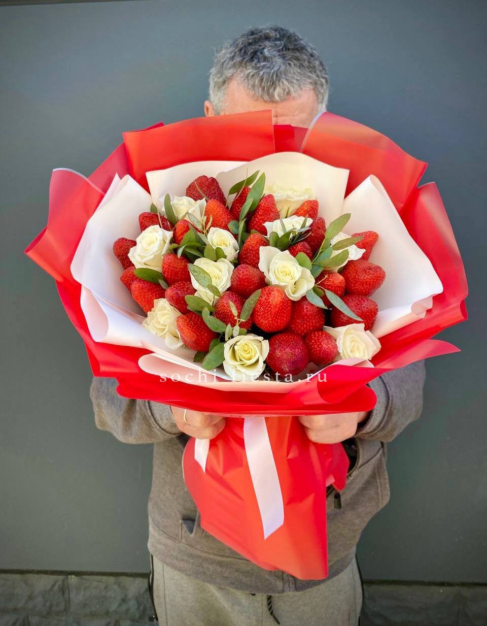 Кустовая роза окружает сочную клубнику, а эвкалипт добавляет свежести всей композиции. Букет упакован в дизайнерскую бумагу и перевязан лентой для аккуратной формы.
