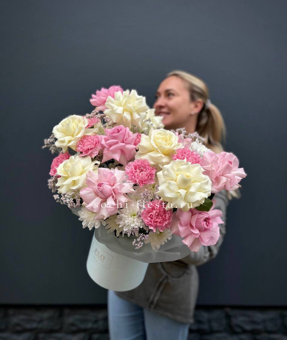 Для заказа товара "Коробка французских роз и диантусов "Бони"" с доставкой в Якутске нажмите в корзину