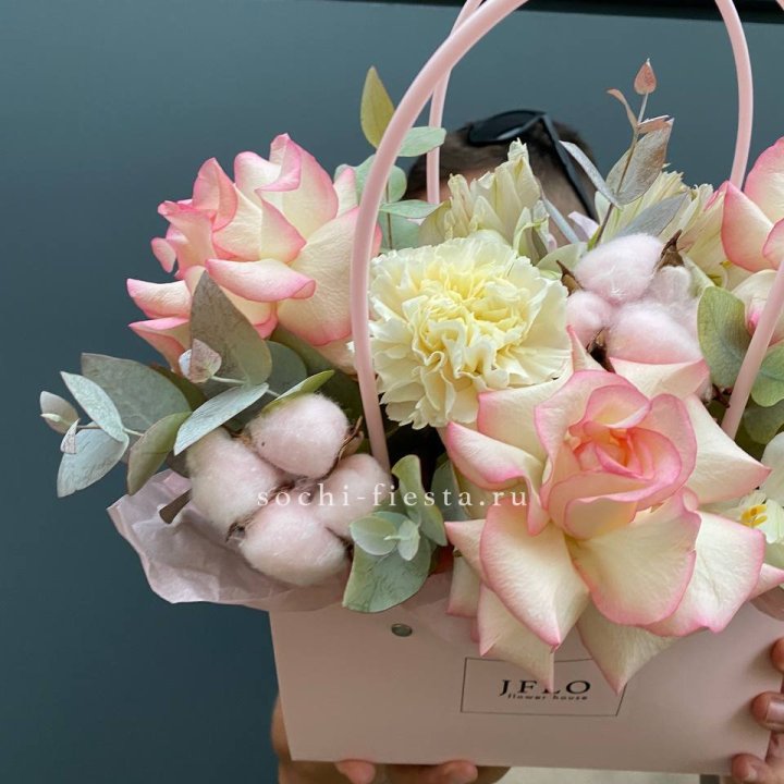 Коробка в студии Якутске — плотный картон с матовой поверхностью, иногда с тиснением логотипа. Внутри — флористическая губка (оазис), предварительно пропитанная водой. Сверху — атласная или шёлковая лента, декоративная тесьма, иногда фирменная открытка.