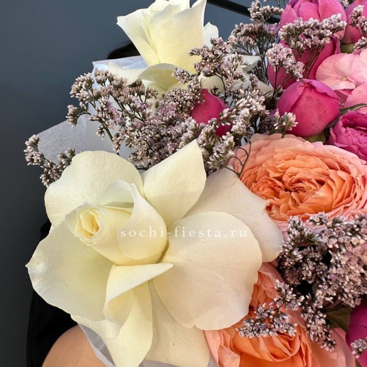Для XXL-коробок и редких сортов — предзаказ за 2-3 дня. Для корпоративных партий (10+ коробок) — брифы за 3-5 дней с утверждением палитры. Для свадеб в пионовый сезон — брифы за 30-60 дней.