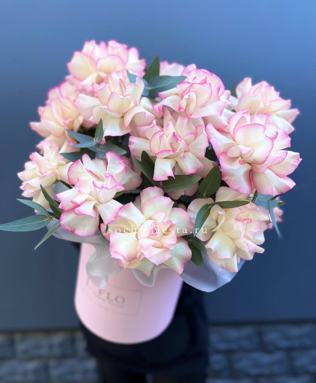 Пятнадцать вывернутых роз в цилиндре держат форму и сохраняют свежесть надолго. Эвкалипт обрамляет композицию серебристой зеленью и добавляет структурности.