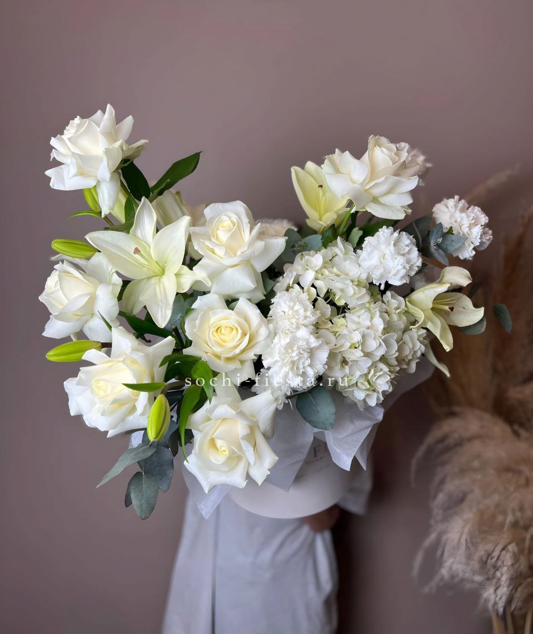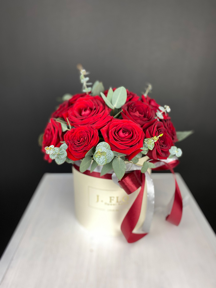 Пионовидные розы раскрываются пышными шапками среди воздушной гортензии и эустомы. Композиция собрана в круглом боксе и держит форму без дополнительной упаковки.
