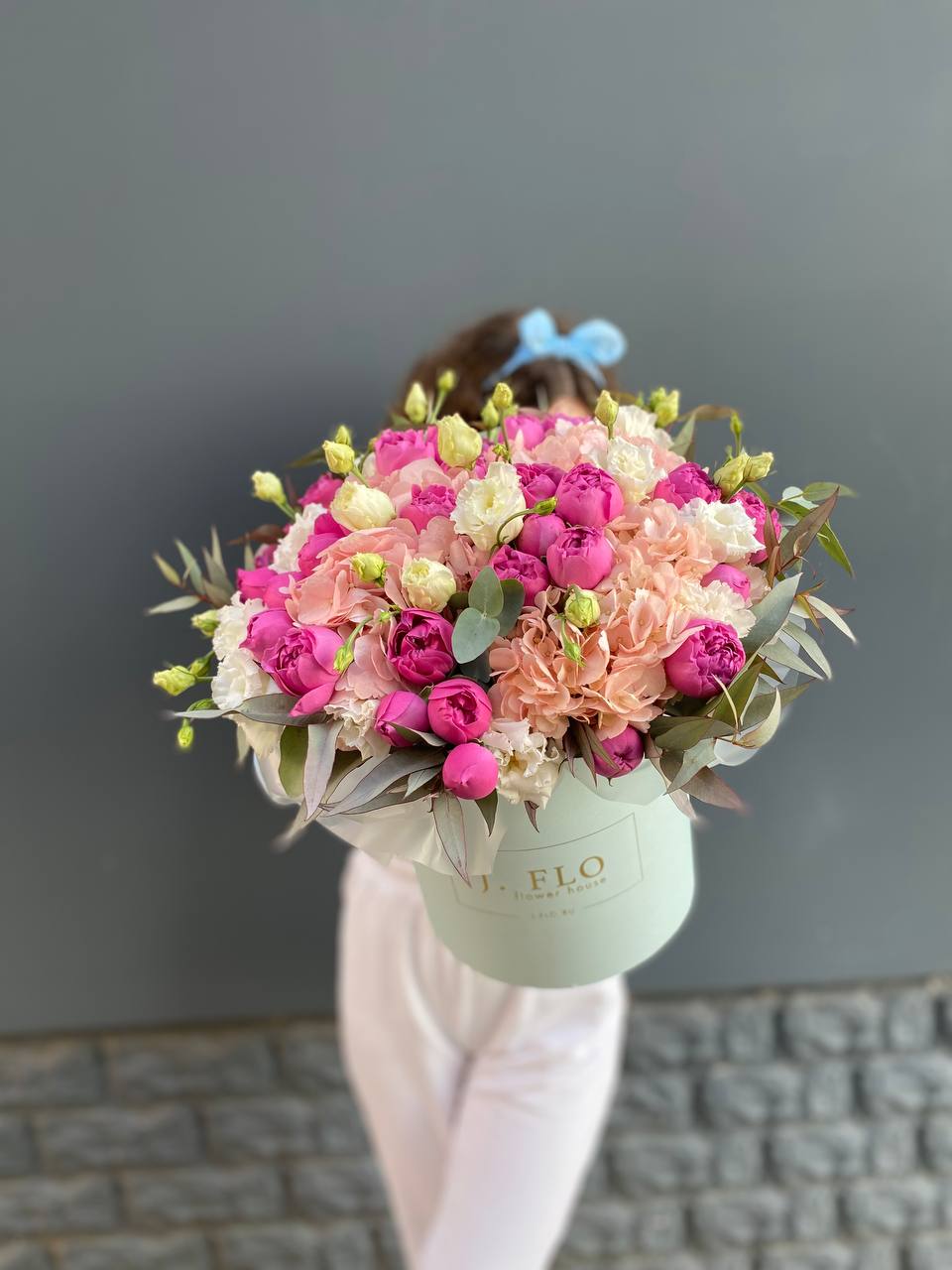 пионовидная роза, гортензия, эустома, декоративная зелень, бокс D20.