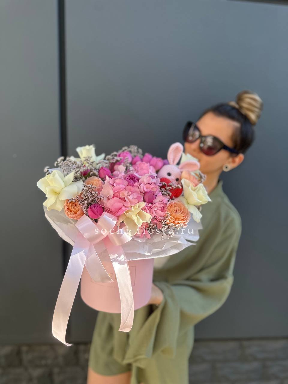 Гортензия и пионовидные розы задают плотную основу, маттиола или дельфиниум вытягивают композицию вверх. Объемная коробка вмещает многослойную структуру из разных форм и высот.
