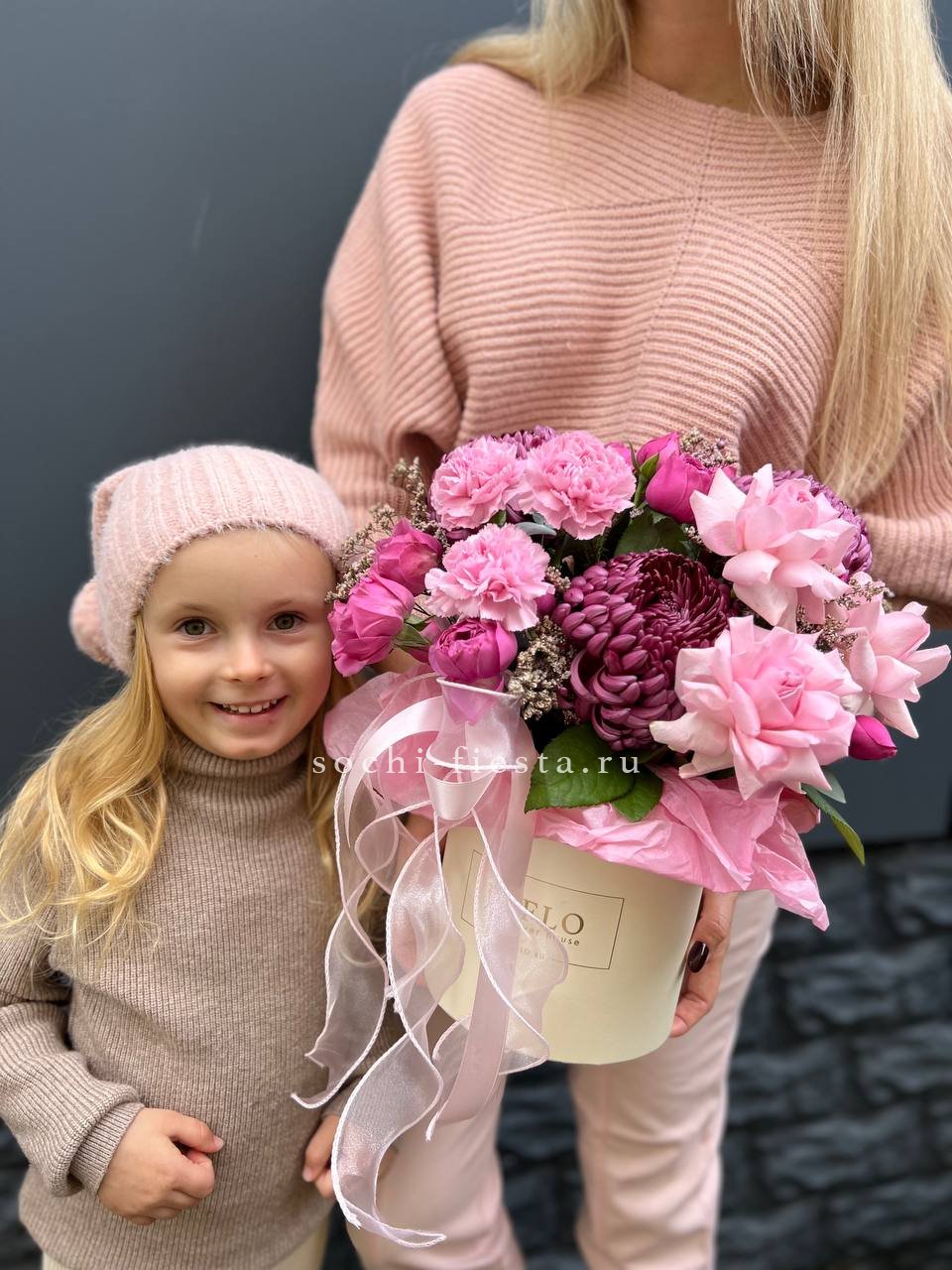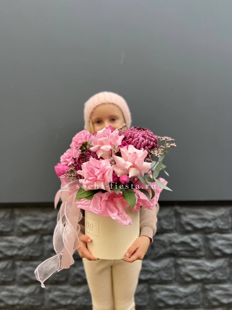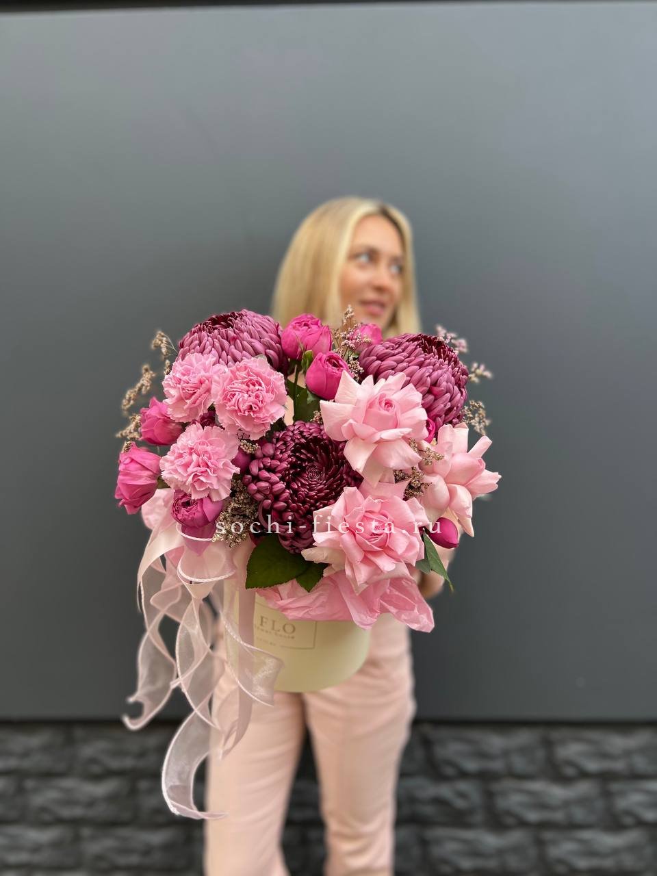 выполнен из хризантем, роз, мисти бабблс, диантусов, лимониума,  цилиндр D16.