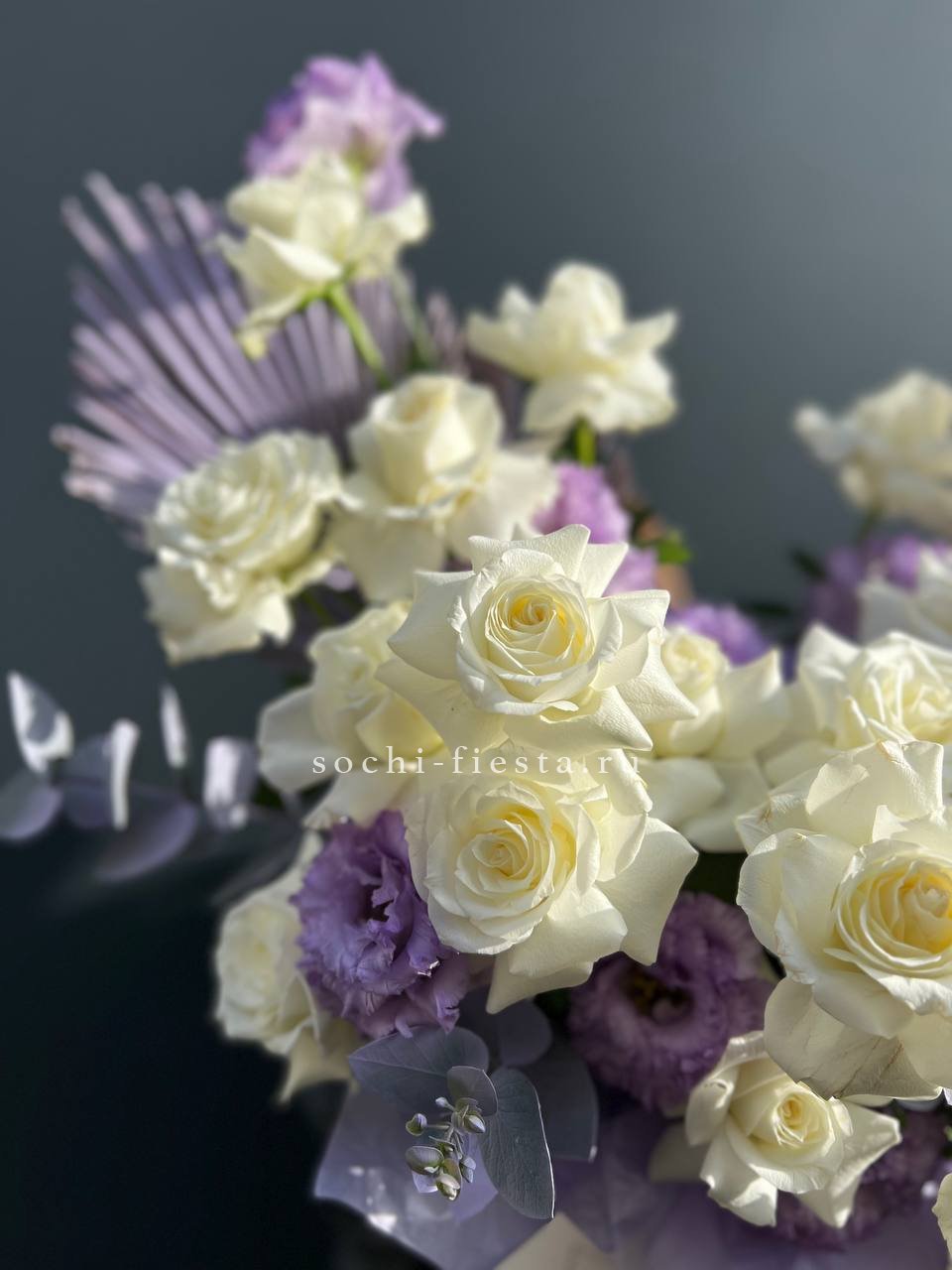 Французские розы и эустомы образуют плотную текстуру с мягкими переходами оттенков. Бархатистые лепестки создают объёмную композицию, которая завершается свежими веточками эвкалипта.