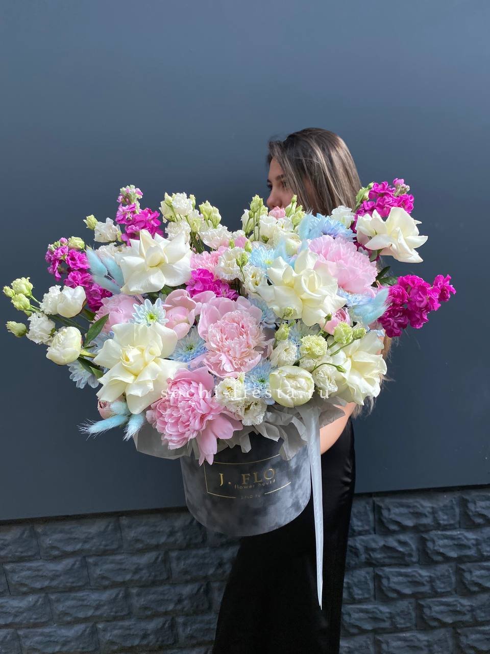 маттиола, пионы, белые розы, эустома, хризантемы, лагурус, бархатный цилиндр D20, эвкалипт, лента, упаковка.