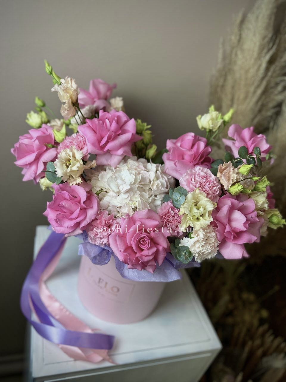 пионовидные кустовые розы бомбастик, гортензия, оазис, тишью, лента.