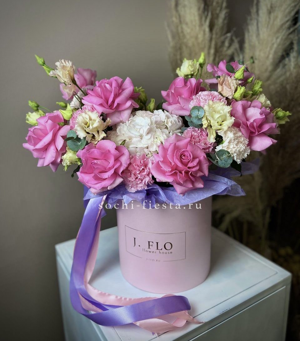 Пышные головки бомбастик наполняют круглую коробку объемом и воздушной структурой. Гортензия добавляет мягкости и завершает композицию в пастельной гамме.