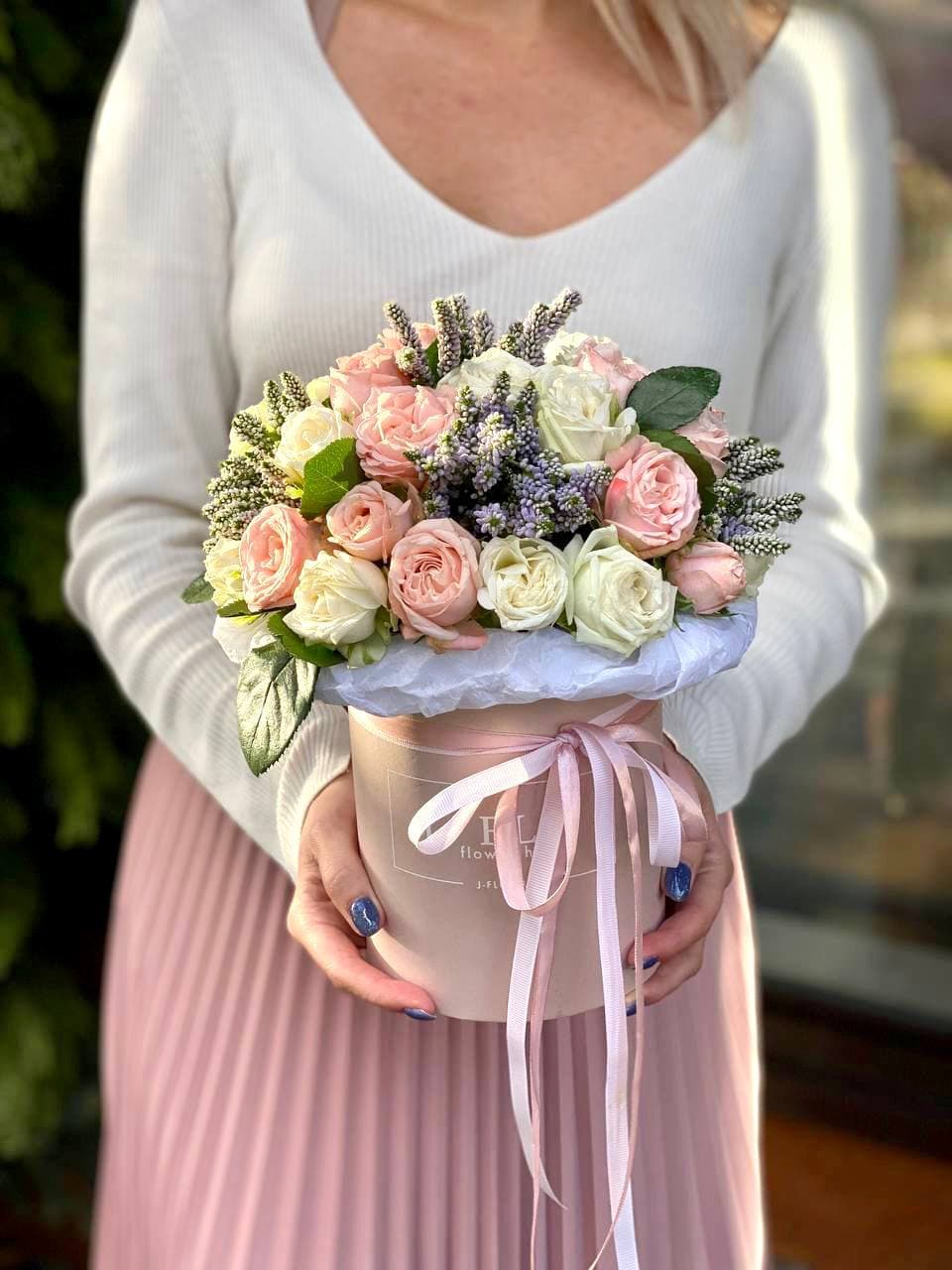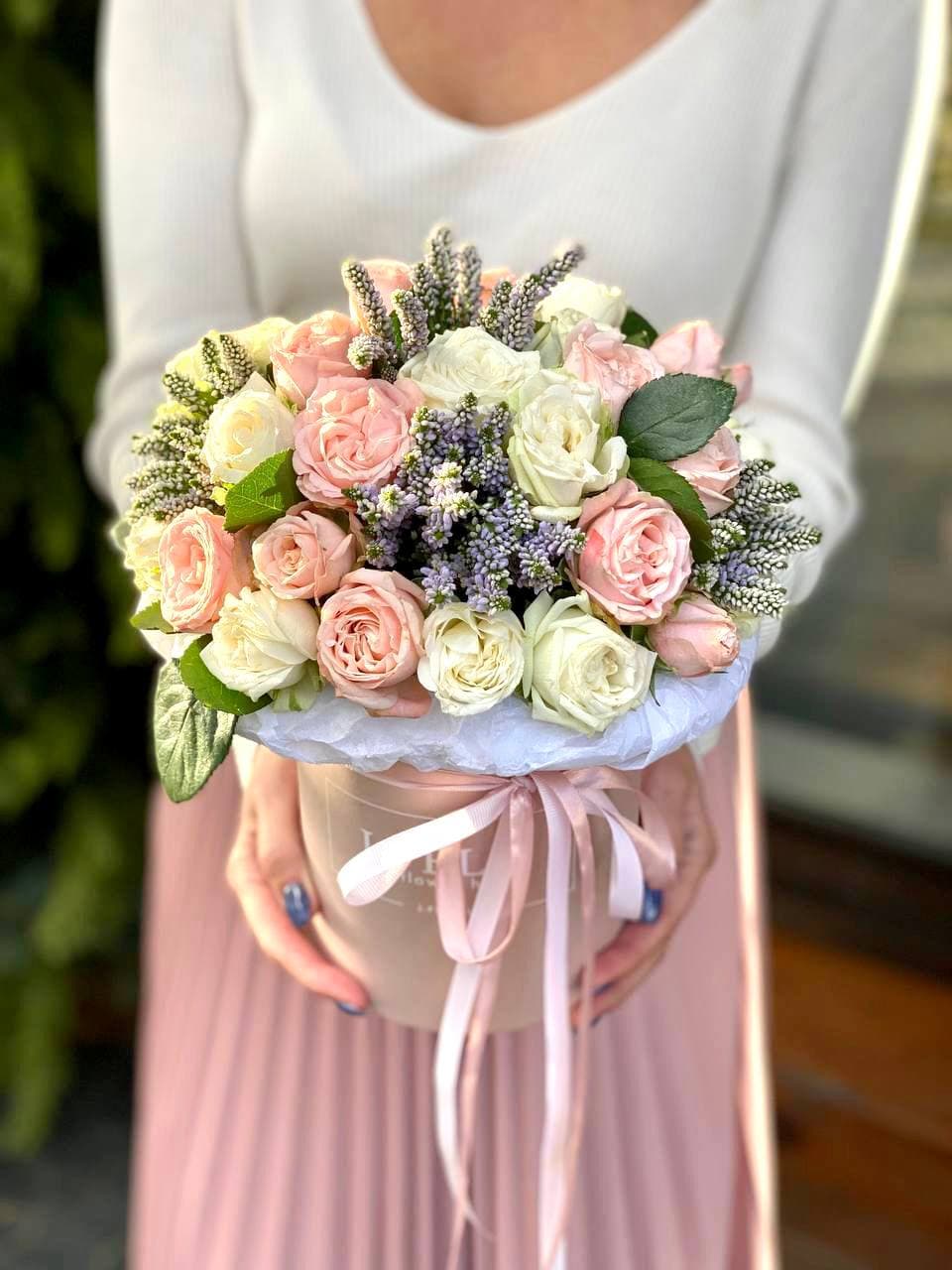 Воздушная композиция в бархатной коробке раскрывается пышными соцветиями гортензии и многолепестковыми бутонами эустомы. Розы двух оттенков создают мягкий переход от белоснежного к пудровому. Флористическая пена сохраняет свежесть каждого цветка надолго.