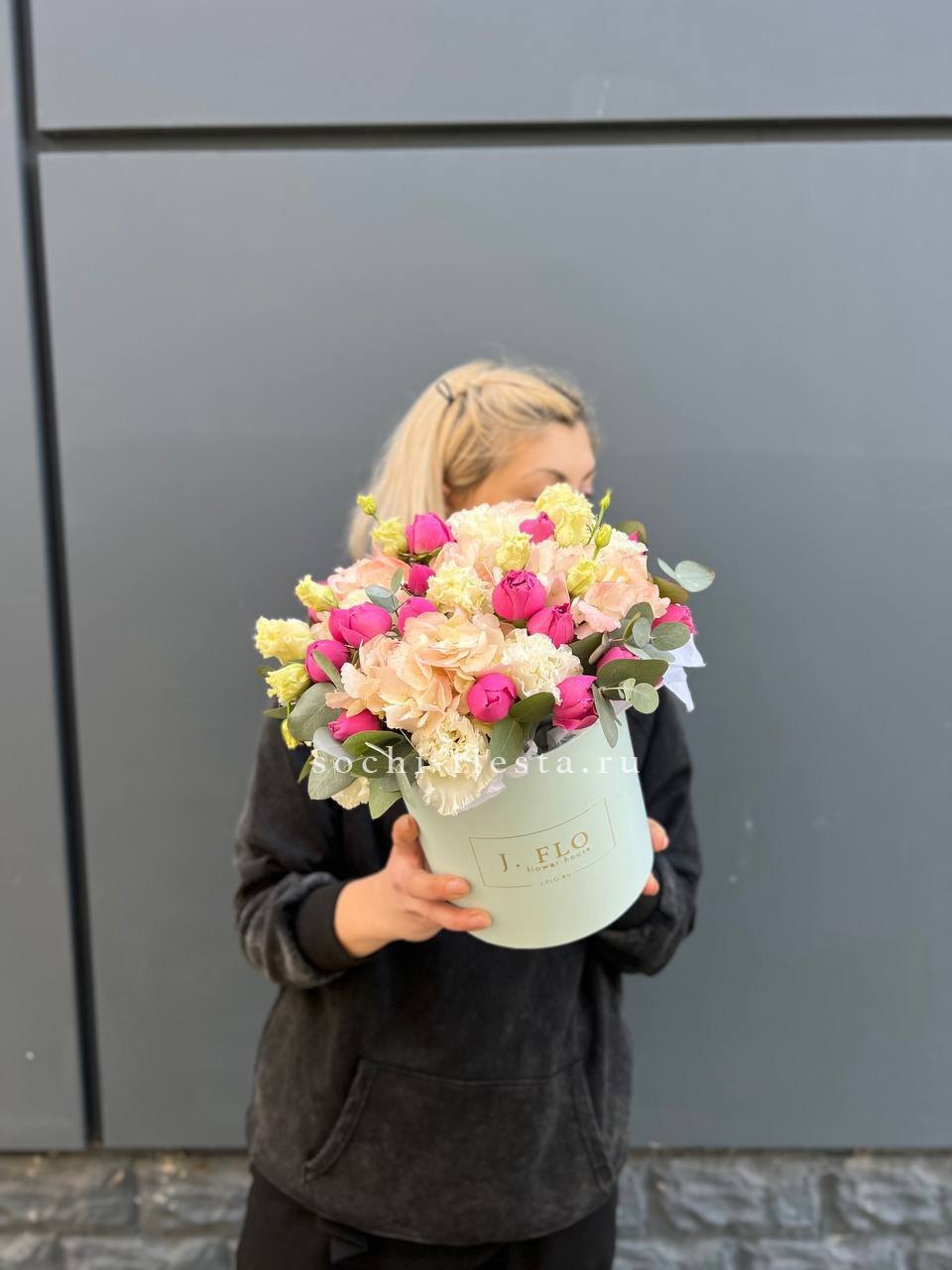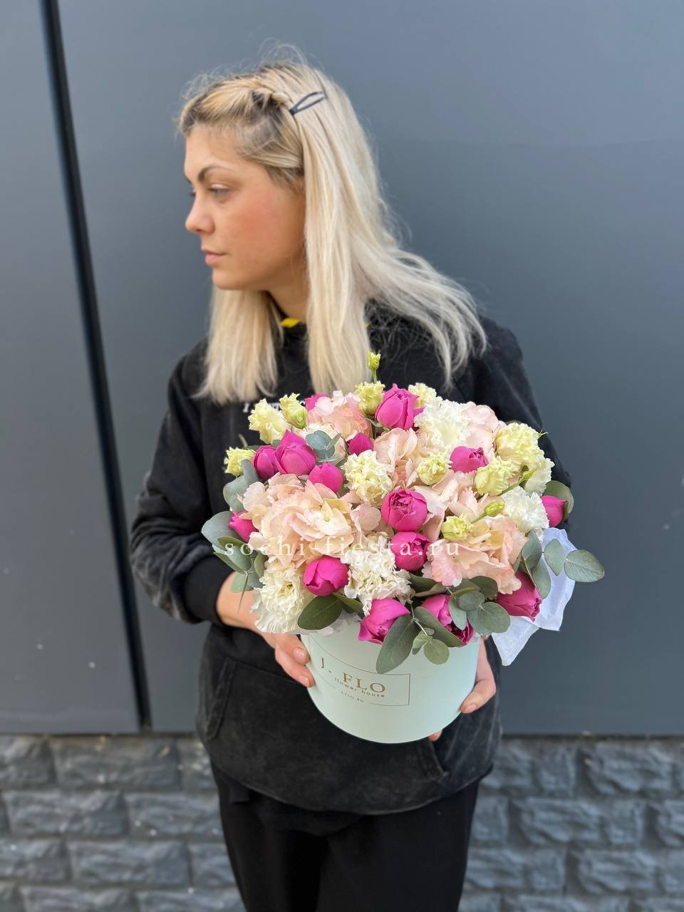 бокс, белая роза, розовая роза, эустома, гортензия, оазис.