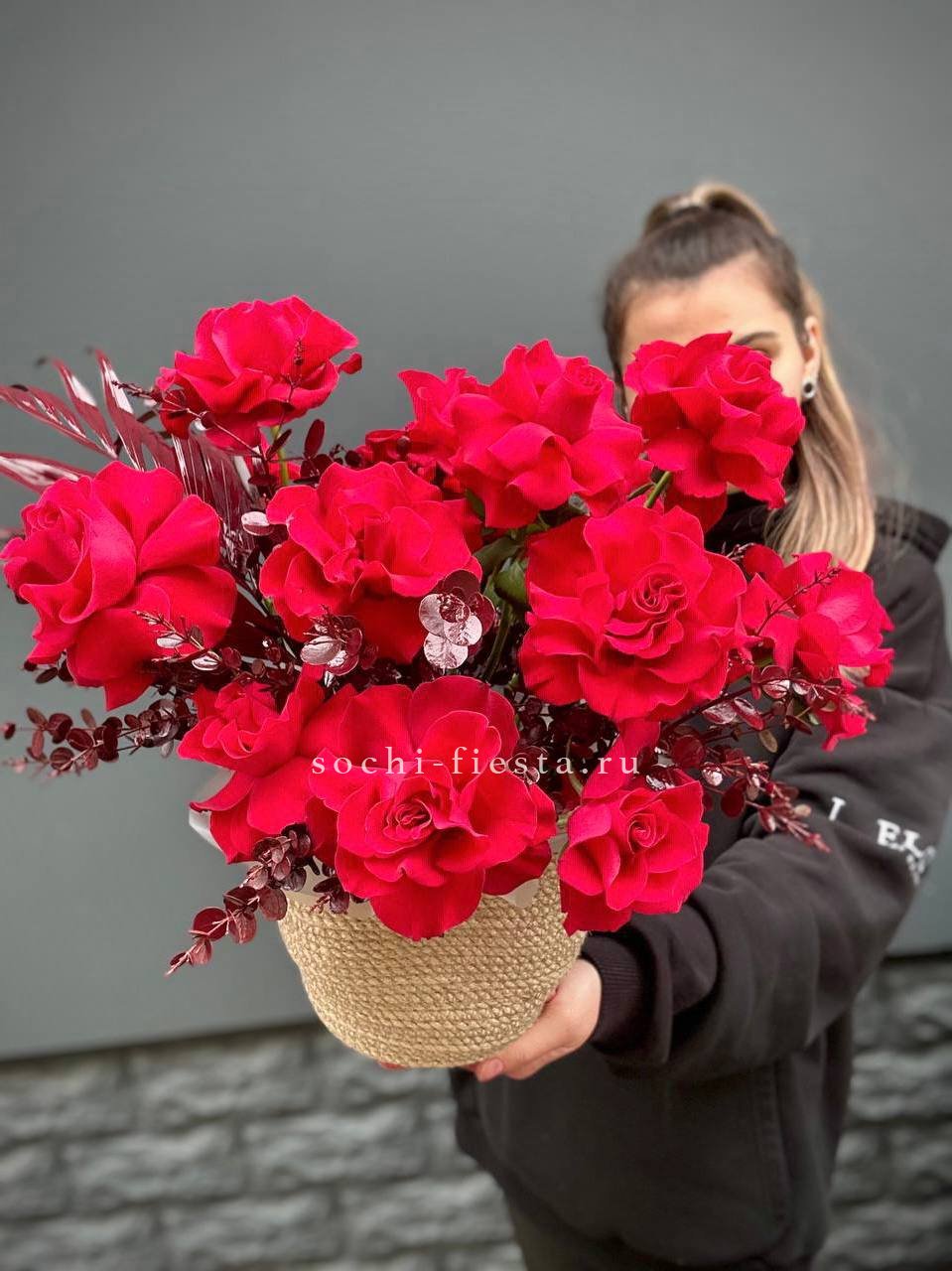 Воздушная гортензия окружает розы пудровых и снежных оттенков, а эвкалипт добавляет глубину и свежесть. Композиция собрана в натуральное джутовое кашпо, которое удобно разместить на столе или подоконнике.