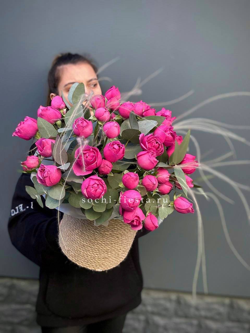 пионовидные розы Мисти Бабблс, джутовое кашпо, стифа, эвкалипт.