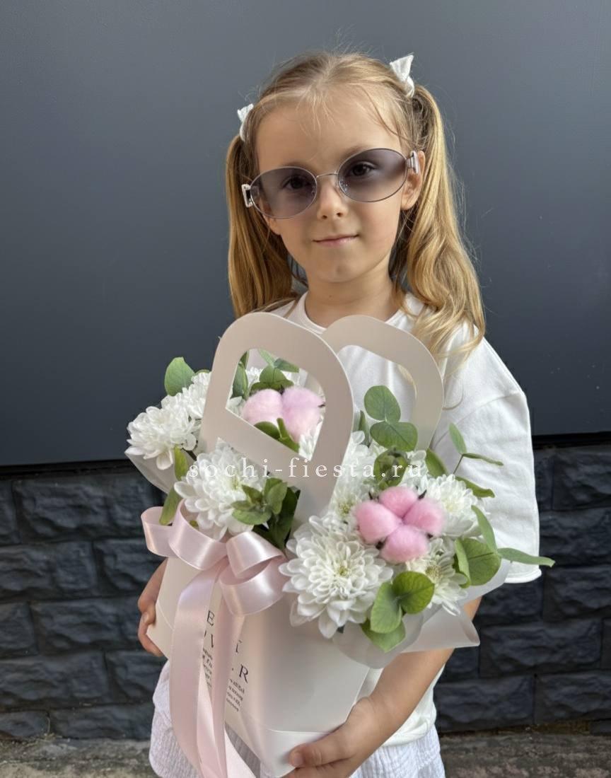 Весенняя композиция в миниатюрной сумочке собрана из хризантем, роз и пушистых веток вербы. Хлопок добавляет мягкости, а эвкалипт освежает общую картину. Компактная форма позволяет разместить её на столе или комоде.