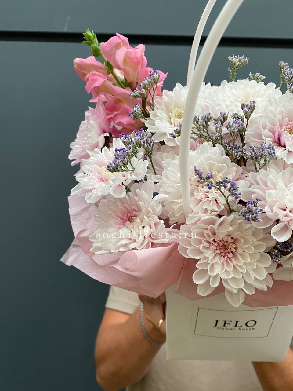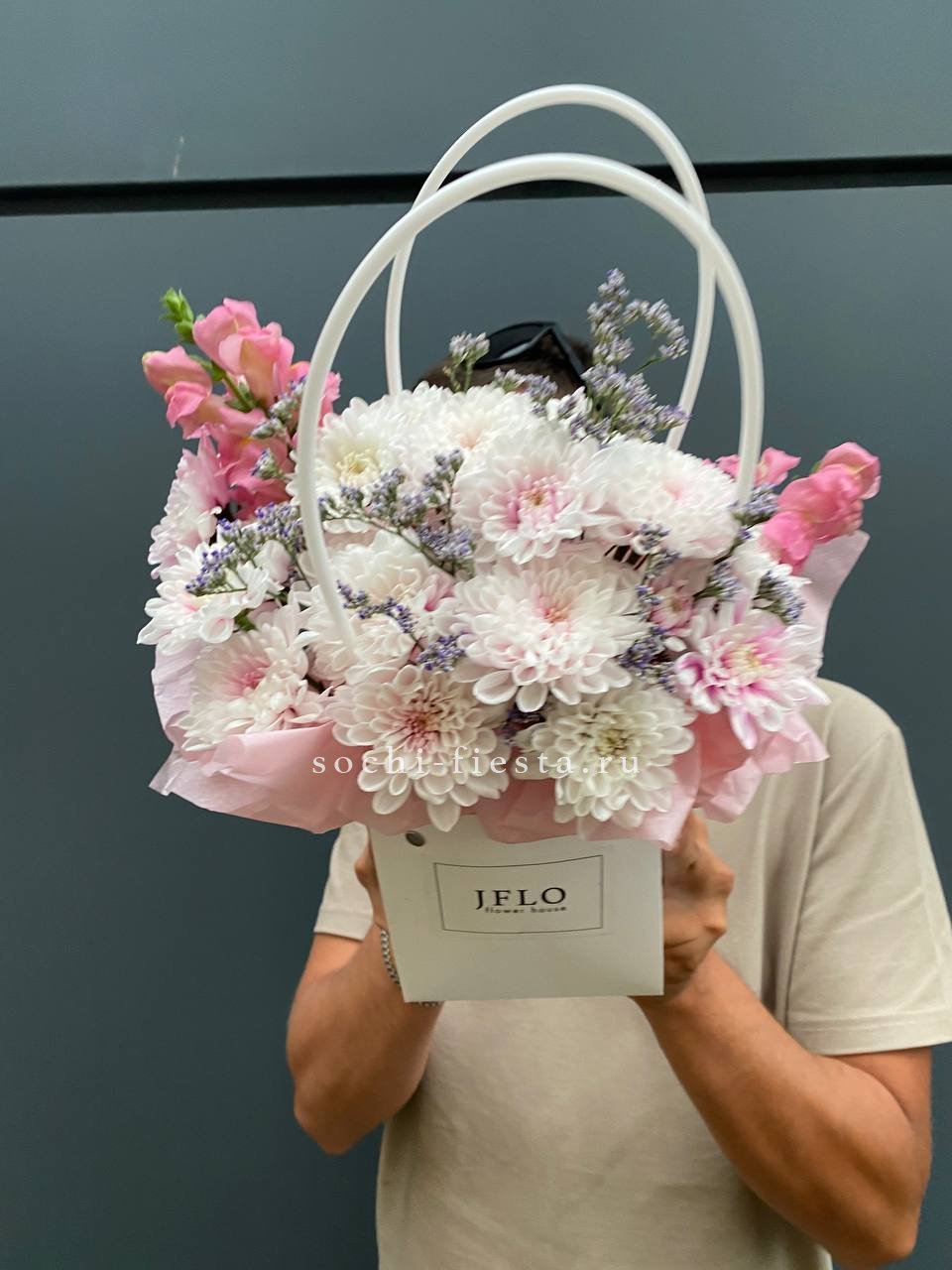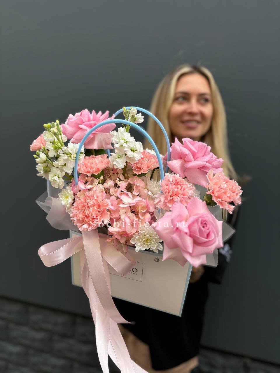 сумочка в нежных тонах из диантусов, роз, гортензий, маттиолы, хризантемы.