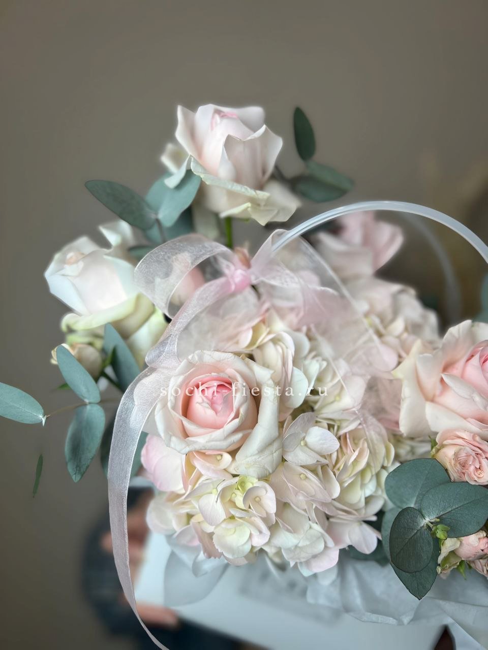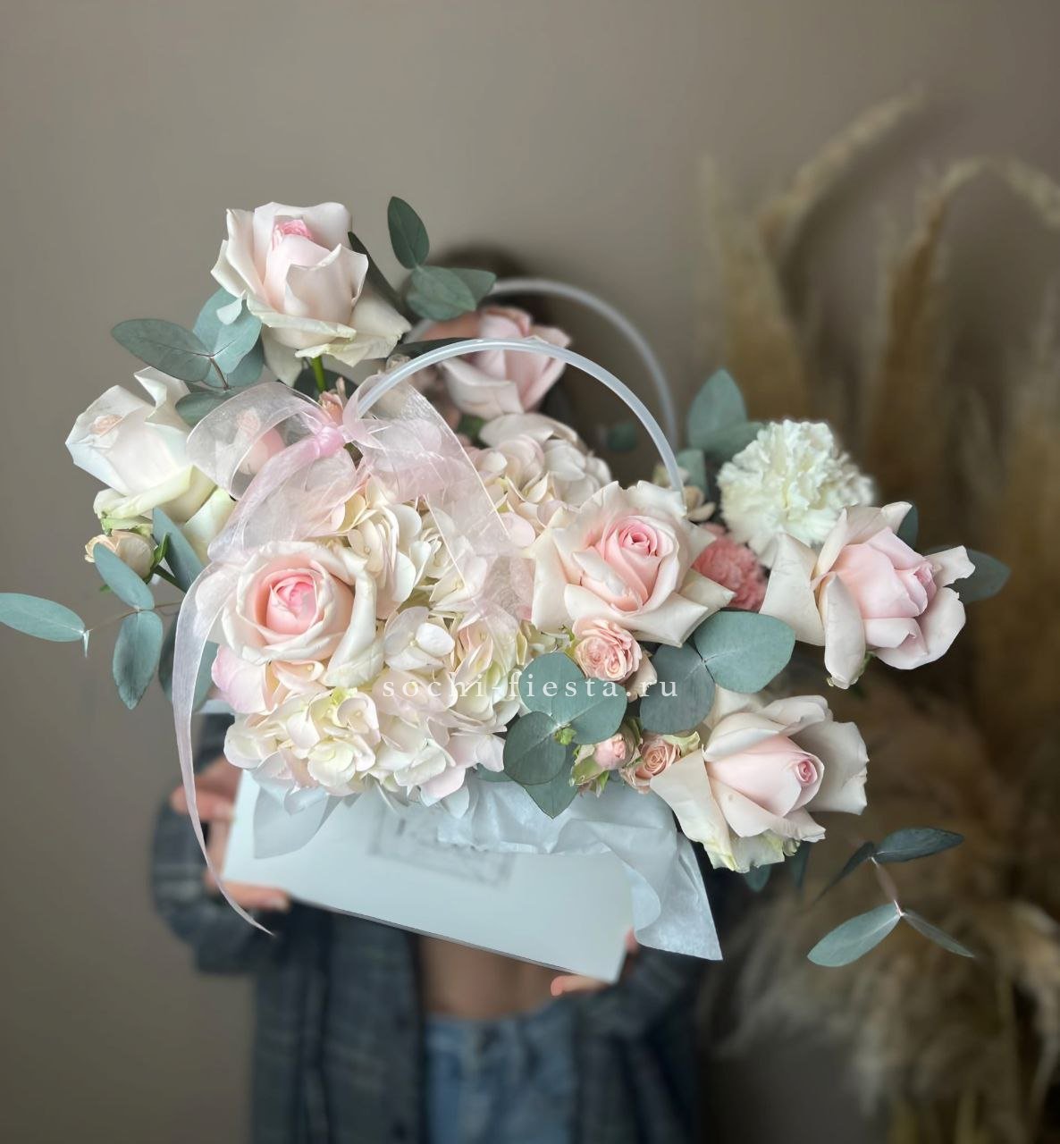 сумочка из гортензии, кустовой розы, герберы и эвкалипта.