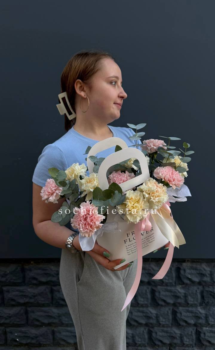 Гортензия создает объемную базу, а герберы и кустовые розы добавляют яркие акценты по всей композиции. Эвкалипт обрамляет сумочку легкими серебристыми ветвями.