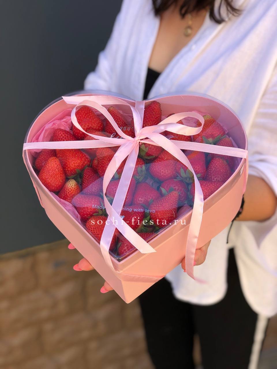 клубника- 500-600г., коробка-сердце (или другой формы по согласованию). Данный товар может быть заказан только совместно с букетом, цветочной композицией или фруктовой корзиной.