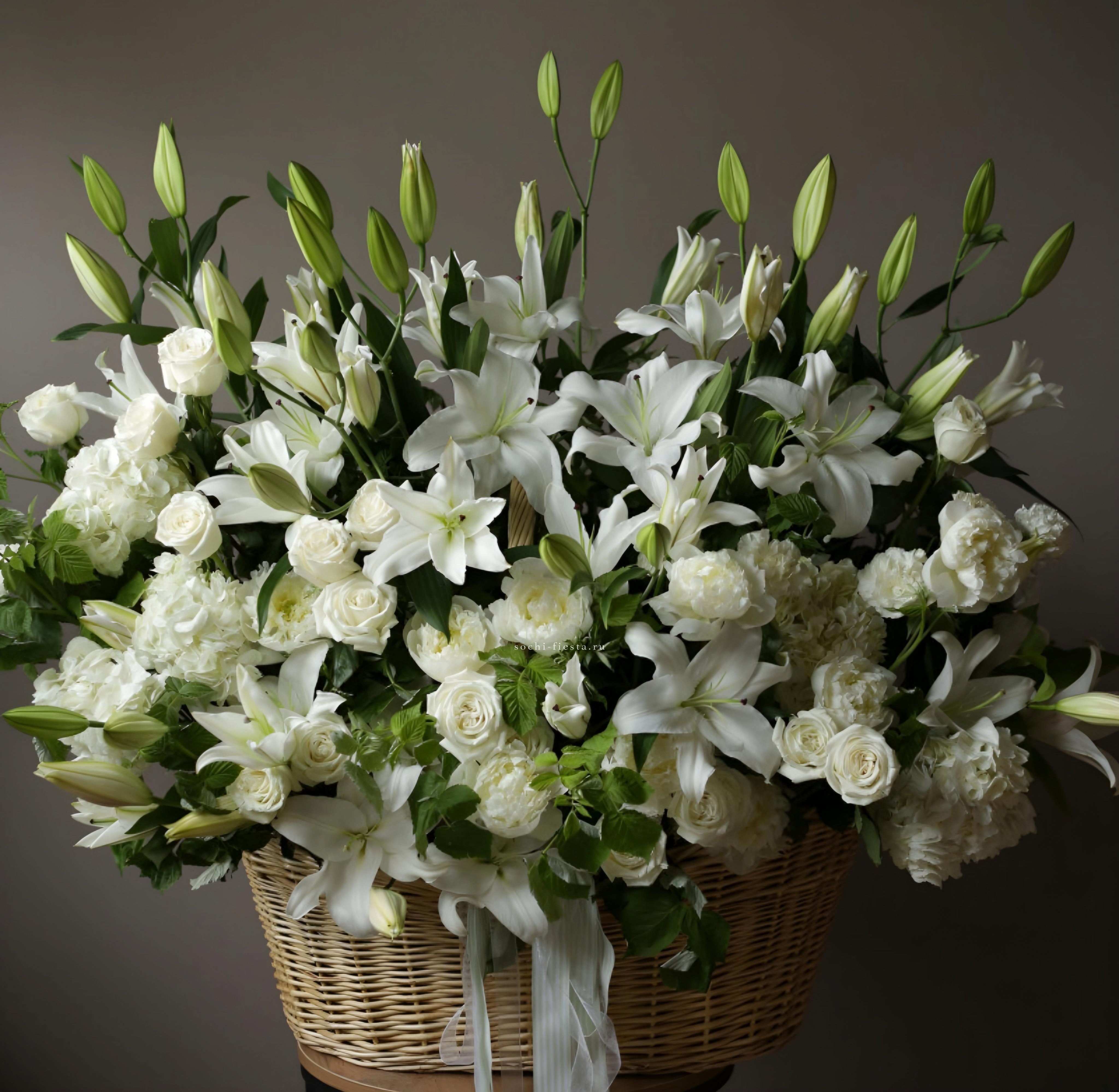 Плотная россыпь бутонов в плетеной корзине создает живописную композицию с переходами от сиреневых до пудровых оттенков. Гортензия и маттиола задают воздушный объем, а розы разной раскрытости добавляют глубину и многослойность всей картине.