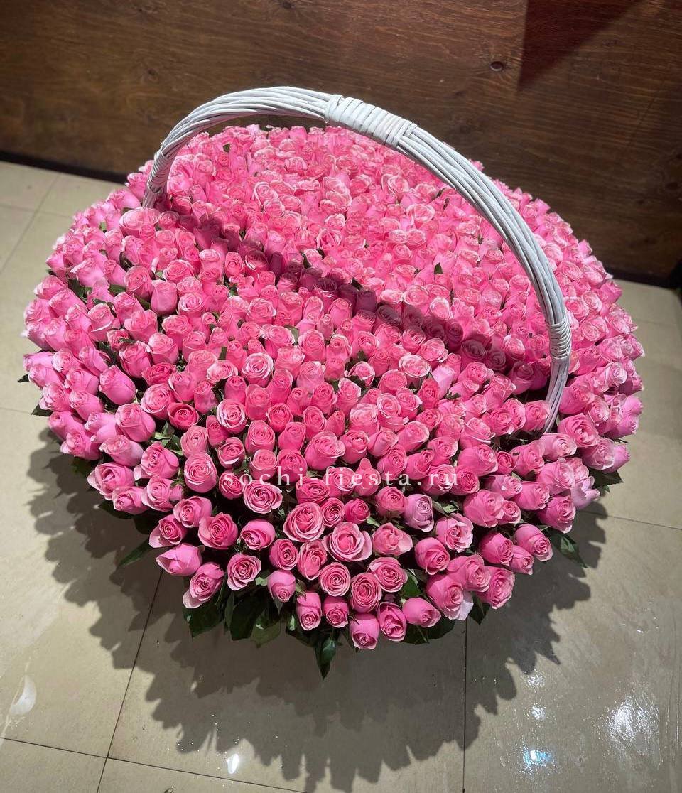 гортензия, эустома, розы, маттиола (дельфиниум или аналоги), кустовые розы, лента, корзина D40