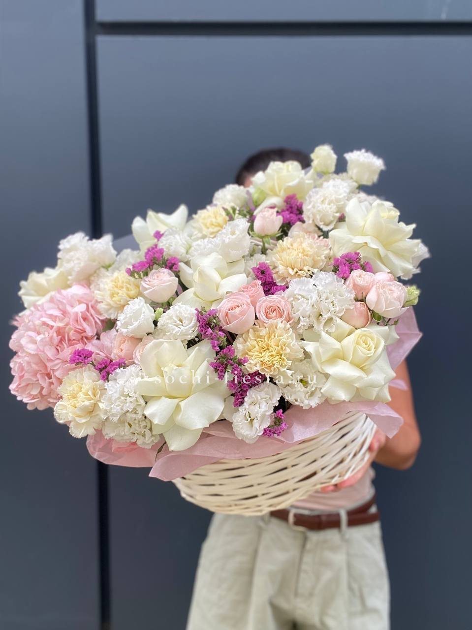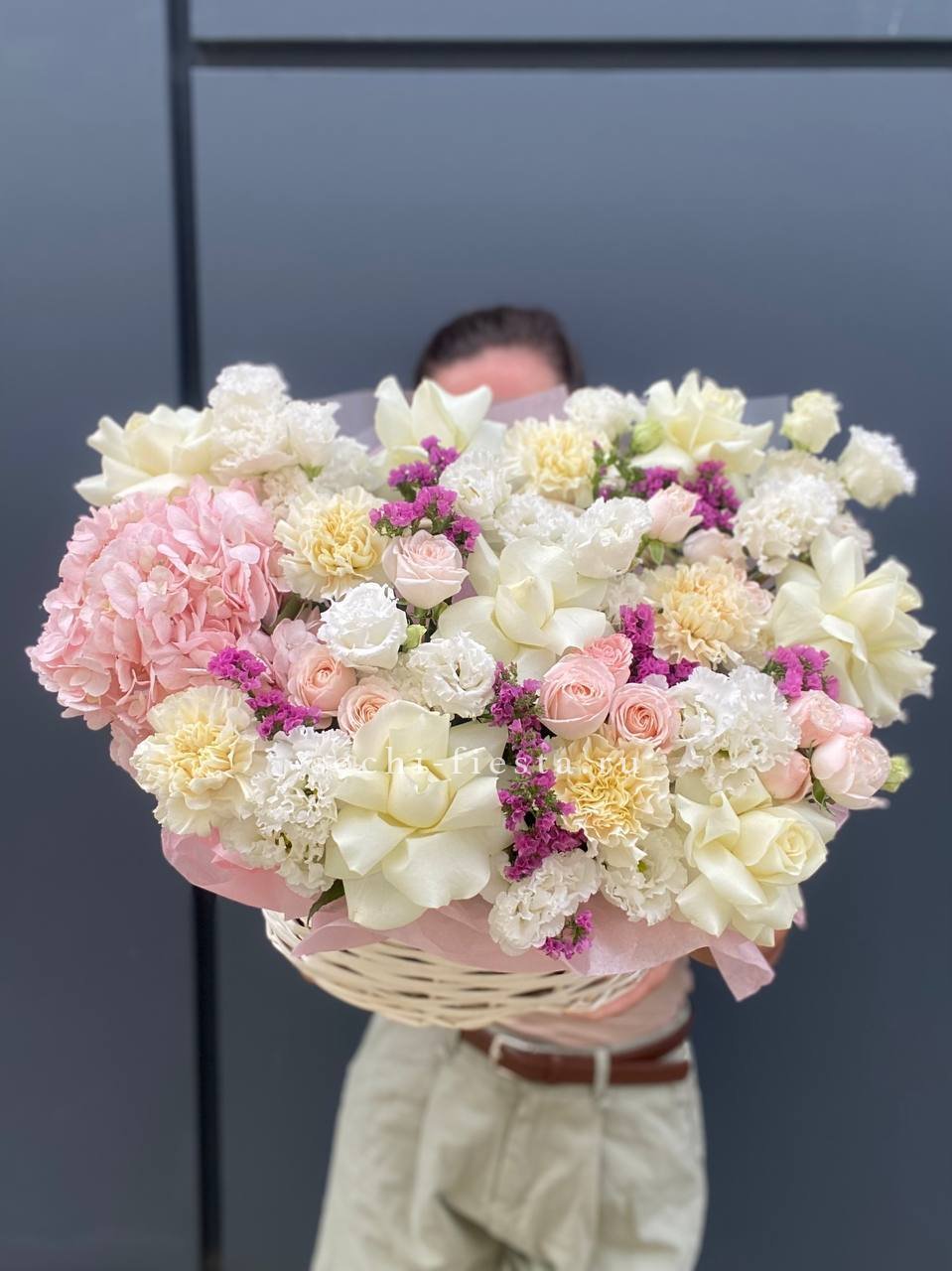 Пышная шапка гортензий в обрамлении воздушных соцветий Мисти Баблс создаёт объёмную композицию в светлой корзине. Эвкалипт добавляет зелени и завершает природную гармонию.