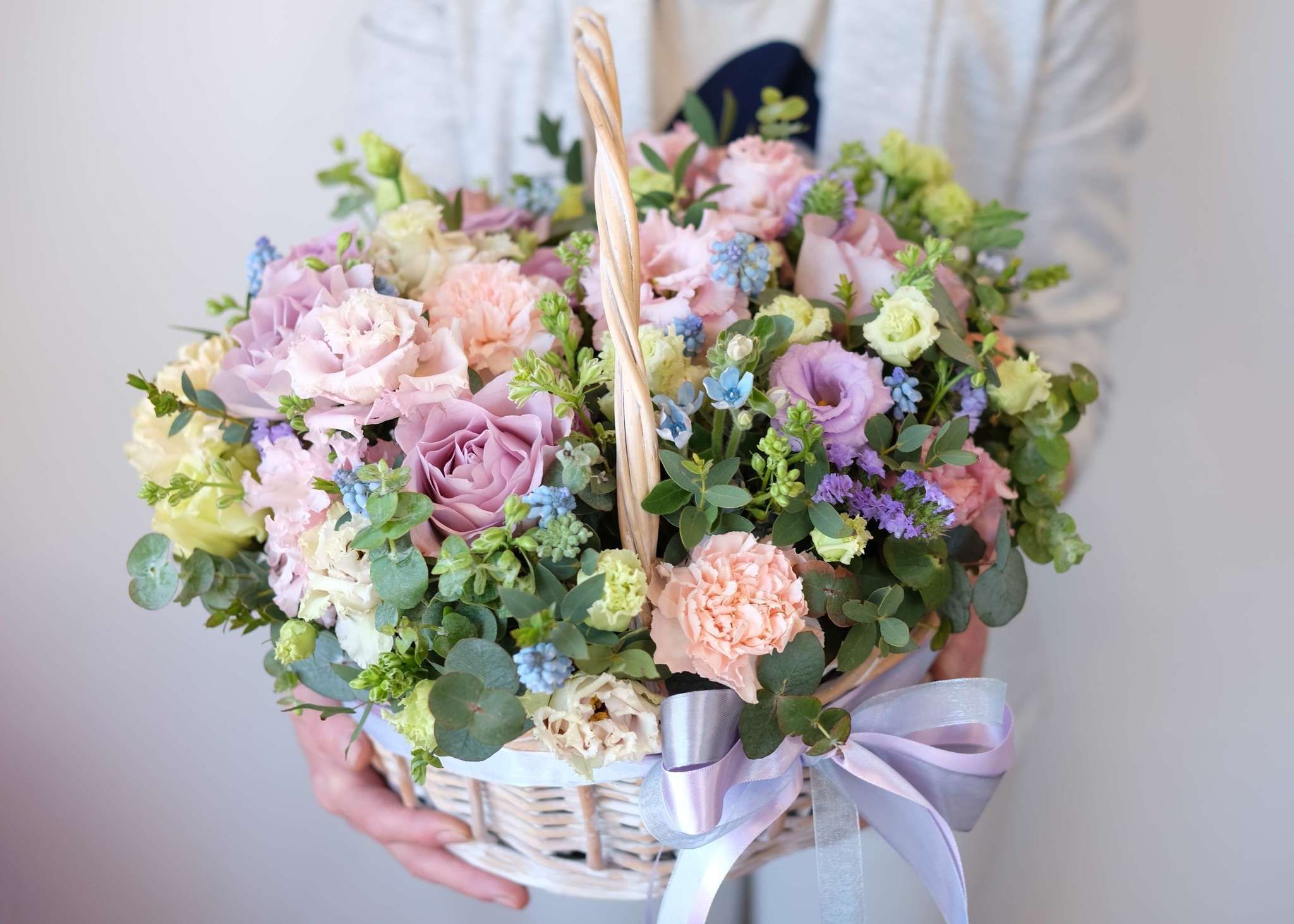 41 пионовидная кустовая роза Misty Bubbles, эвкалипт, светлая корзина.