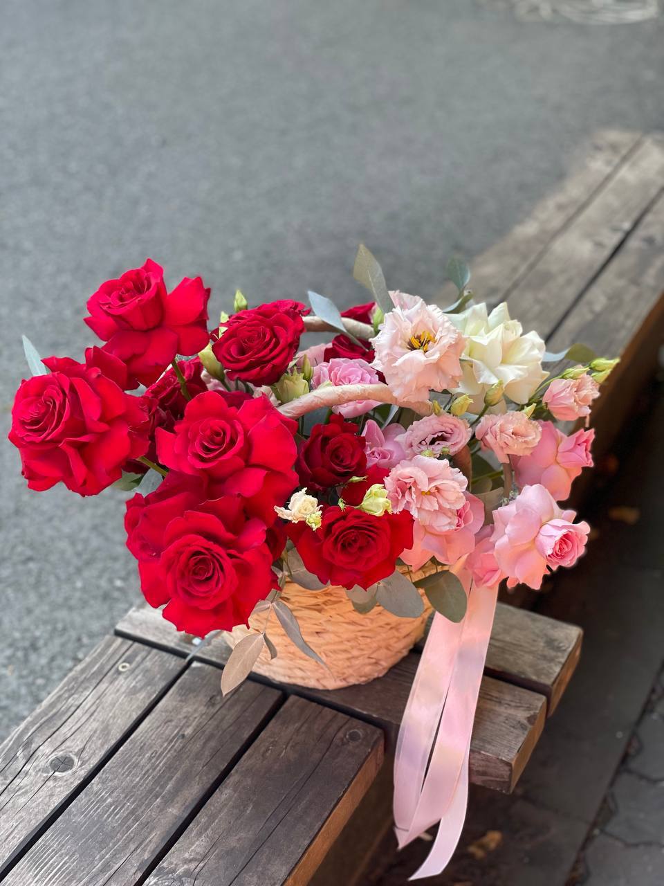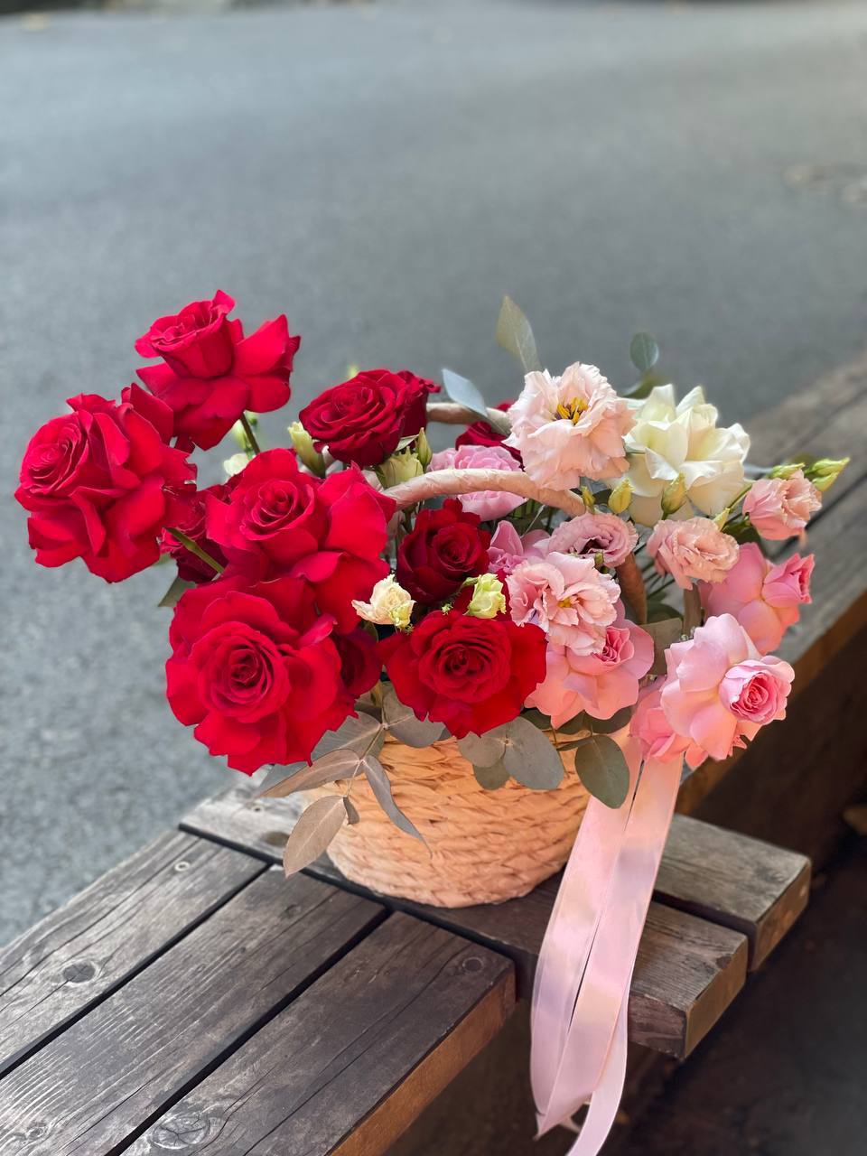 Сорок одна пионовидная роза в светлой корзине выстраивает объёмную композицию с мягкими переливами лилового и розового. Эвкалипт обрамляет густую россыпь бутонов.
